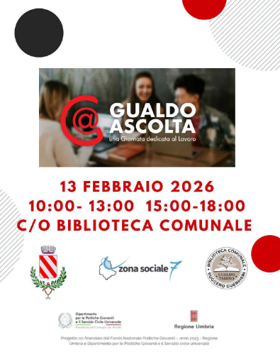 Il lavoro come leva di sviluppo, inclusione e futuro dei territori: è questo il cuore di @Gualdo Ascolta – una giornata dedicata al lavoro, in programma venerdì 13 febbraio 2026 presso la Biblioteca Comunale “Ruggero Guerrieri” di Gualdo Tadino, dalle 10:00 alle 13:00 e dalle 15:00 alle 18:00. L’iniziativa nasce in sinergia con i Comuni della Zona Sociale 7, con l’obiettivo di rafforzare il dialogo tra istituzioni, imprese, sistema formativo e cittadini, offrendo strumenti concreti di orientamento e inserimento lavorativo. La giornata è pensata per favorire l’incontro tra domanda e offerta di lavoro, valorizzare la formazione professionale, dare spazio alle realtà produttive del territorio e offrire occasioni di orientamento a giovani, disoccupati, inoccupati, neolaureati e job hopper.