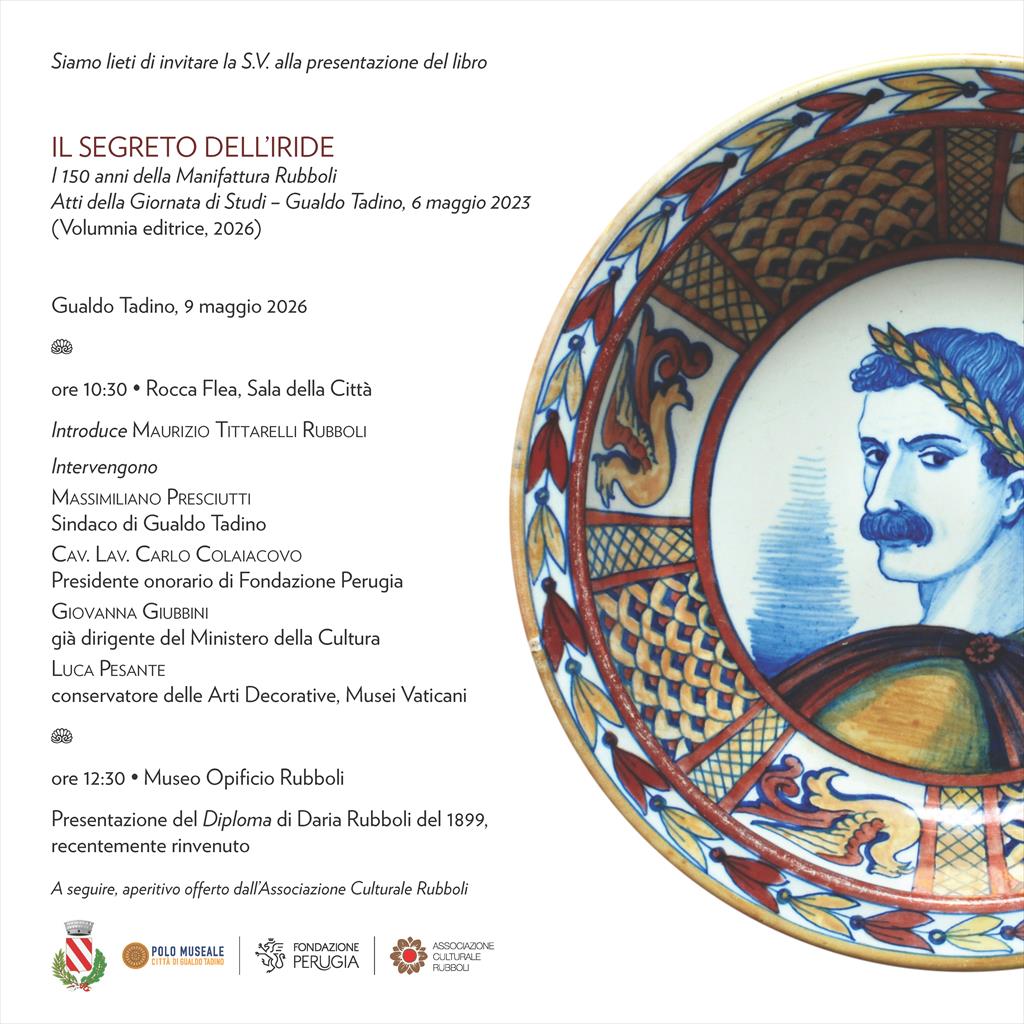 L'Associazione Culturale Rubboli esprime grande orgoglio nel poter condividere con la comunità e con gli studiosi un importante capitolo della propria storia, sottolineando come la Manifattura Rubboli abbia lasciato un segno indelebile nell'arte ceramica italiana e come il nuovo volume aggiunga ulteriori approfondimenti alla sua storia. Il 9 maggio 2026, presso la Rocca Flea – Sala della Città di Gualdo Tadino, sarà presentato il libro Il Segreto dell'Iride. I 150 anni della Manifattura Rubboli, pubblicato da Volumnia editrice con l’editing e la veste grafica a cura di Raffaele Marciano. Il volume raccoglie gli Atti della Giornata di Studi svoltasi a Gualdo Tadino il 6 maggio 2023. I contributi degli studiosi presenti nel volume sono il frutto di un lungo lavoro di ricerca e valorizzazione di una delle realtà di artigianato artistico più significative nel panorama italiano tra XIX e XX secolo. La giornata si articolerà in due momenti distinti. A partire dalle ore 10:30 si terrà la presentazione ufficiale del volume, introdotta da Maurizio Tittarelli Rubboli. Porteranno il loro contributo Massimiliano Presciutti, Sindaco di Gualdo Tadino, il Cav. Lav. Carlo Colaiacovo, Presidente onorario di Fondazione Perugia, Giovanna Giubbini, già dirigente del Ministero della Cultura e Luca Pesante, conservatore delle Arti Decorative dei Musei Vaticani. Un parterre di alto profilo istituzionale e scientifico che testimonia il valore storico e artistico della Manifattura Rubboli. Alle ore 12:30 il programma proseguirà al Museo Opificio Rubboli con un momento di particolare rilevanza: la presentazione del Diploma di Daria Rubboli del 1899, recentemente rinvenuto — un documento raro e prezioso che arricchisce ulteriormente la conoscenza della storia della famiglia e della manifattura. A seguire, l'Associazione Culturale Rubboli sarà lieta di ospitare i convenuti per un momento conviviale.