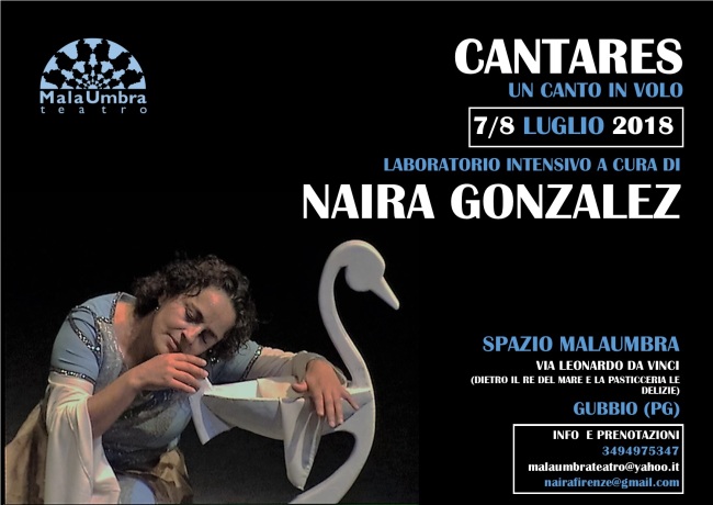 Allo SpazioMalaUmbra di Gubbio due giornate intense con il workshop “Cantares, un canto in volo” tenuto da Naira Gonzalez, che si terrà il 7 e l’8 Luglio nello spazio gestito dall’associazione teatrale MalaUmbra Teatro di Gubbio. Naira Gonzalez, ventotto anni di lavoro pedagogico alle spalle, in tutta Italia ha tenuto più di mille stage e laboratori residenziali con adulti adolescenti e bambini. Gestito gruppi sulla voce, il corpo, la costruzione del burattino, la ricerca del personaggio, la creazione dei costumi di scena, il canto, i cori. Ai suoi laboratori hanno partecipato e partecipano: Counselor, coach, psicologhi, psichiatri esperti, musicisti e cantanti professionisti, sociologhe, pittori, poetesse, studenti di filosofia, attori professionisti e amatoriali, studenti del DAMS e altre università Italiane, casalinghe, sportivi, doppiatrici, costumiste. “Cantares, un canto in volo” è un workshop di "tecnica pura" dove si lavora sulla poesia della voce, la sua forza e l'anima. L' obiettivo di questo viaggio è quello di imparare a "dare forza alla nostra voce senza strillare, renderla corposa capace di riempire tutto lo spazio, di pronunciare un testo utilizzando variegati colori, come un paesaggio fatto di fiumi, cascate, sole, neve" (Naira Gonzalez).