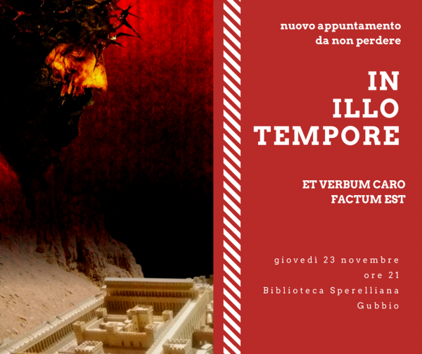 "In illo tempore... I luoghi e la storia di Gesù". Si intitola così il nuovo ciclo di incontri promossi dall'associazione "Benedetto XVI" in programma il giovedì sera alle ore 21 presso la Biblioteca Sperelliana di Gubbio. Il titolo scelto per questo nuovo appuntamento, il terzo della serie, è "Et Verbum caro factum est".
