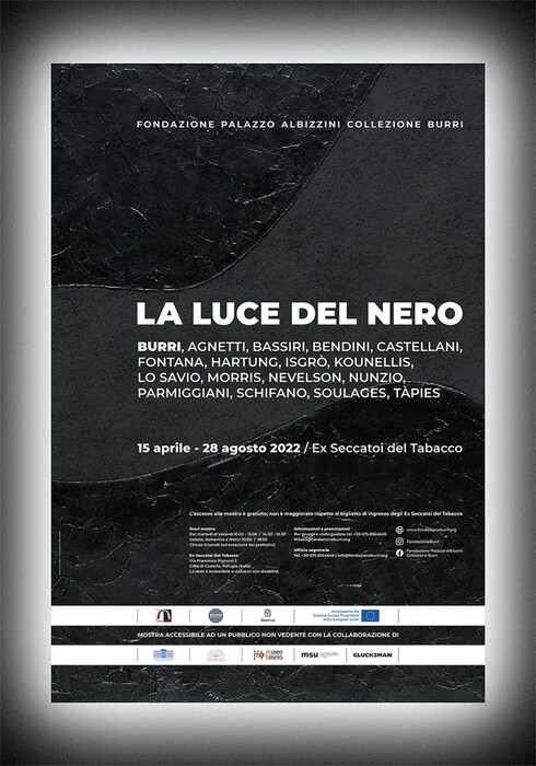 "La Luce del Nero" è il titolo della mostra che si potrà ammirare dal 15 aprile al 28 agosto a Città di Castello, agli Ex Seccatoi del Tabacco, una delle due sedi espositive della Fondazione Burri. Si tratta di un evento - curato da Bruno Corà, presidente della Fondazione Burri, in cui il tema del nero è stato studiato per essere inclusivo del pubblico non vedente, oltre a offrire un'esperienza sensoriale a tutti i visitatori. Tra gli artisti della seconda metà del XX secolo, Burri - sottolineano i promotori - è colui che più di ogni altro ha usato il nero, giungendo perfino a dipingere totalmente di nero gli Ex Seccatoi del Tabacco, edifici industriali diventati sedi museali dei suoi grandi cicli pittorici. Insieme a Burri hanno realizzato opere elaborate col nero anche artisti documentati in mostra, come Agnetti, Bassiri, Bendini, Castellani, Fontana, Hartung, Isgrò, Kounellis, Lo Savio, Morris, Nevelson, Nunzio, Parmiggiani, Schifano, Soulages e Tàpies. La mostra "La Luce del Nero" è stata realizzata nell'ambito del programma Europa Creativa con il progetto "Beam Up" (Blind Engagement In Accessible Museum Projects), che affronta in chiave internazionale e inclusiva il tema dell'accessibilità dell'arte contemporanea per il pubblico con disabilità visiva. L'esposizione corona la riapertura degli spazi degli ex Seccatoi del Tabacco dopo sette anni di lavori che hanno integralmente riqualificato questi ambienti.