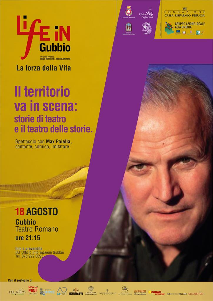 "Il territorio va in scena: storie di teatro e il teatro delle storie". È questo il titolo dello spettacolo che domani, mercoledì 18 agosto al Teatro Romano di Gubbio, avrà inizio alle 21.15 e che si inserisce nel programma del festival Life in Gubbio, manifestazione artistica nata nel 2007. Dopo l'evento inaugurale del 5 agosto, incentrato sulla figura di San Domenico Di Guzman, la kermesse punta su Max Paiella. Nello spettacolo il cantante, comico, imitatore si cimenta in una riflessione sull'esaurimento delle risorse culturali, naturali, sulla scomparsa delle tradizioni, dei dialetti. La denuncia dell'insostenibilità del modello di sviluppo in atto nasconde tuttavia l'idea propositiva per cui ad ogni fine corrisponde un nuovo inizio. Paiella dei 20 teatri italiani in cui fa tappa, racconta i territori in cui sorgono tentando di trasformare i palchi in piattaforme di comunicazione ambientale capaci di sensibilizzare i rispettivi pubblici. Gli eventi in calendario non finiscono qui per Life in Gubbio, che per venerdì 20 propone una serata sul Sommo Poeta dal titolo "L'attuale inattualità di Dante" al chiostro di San Francesco. Dialogheranno sull'opera dantesca il sindaco di Gubbio Filippo Stirati e lo scrittore Filippo La Porta durante la presentazione di "Come un raggio d'acqua", ultima pubblicazione del saggista. Lunedì 23 agosto appuntamento al chiostro di San Francesco con le parole e la musica di Paolo Vallesi, cantautore che attraverso lo spartito racconterà la forza della sua vita, degli avvenimenti professionali e non, gli ideali, le speranze e il riscatto trovato nella musica.