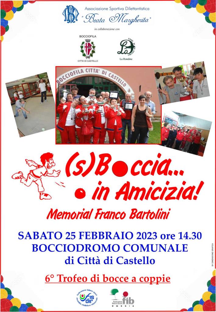 (s)Boccia in amicizia: memorial Franco Bartolini, sabato 25 febbraio alle ore 14,30 presso il Bocciodromo comunale di Città di Castello. Torneo di bocce a coppie formate da un atleta diversamente abile della società sportiva "BM"ed un pensionato della società bocciofila. Il torneo è organizzato congiuntamente dalla bocciofila Città di Castello e l' ASD "Beata Margherita" in memoria di "Franchino", Franco Bartolini, uno dei ragazzi con disabilità che è stato molto amato nel quartiere San Giacomo, del quale era un personaggio simbolo.
