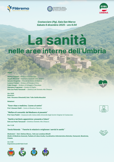 La necessità di azioni per il popolamento e la tutela dei piccoli borghi, scaturisce dalla consapevolezza del valore civile, educativo, simbolico, spirituale, evocativo delle memorie, in essi contenuto e giunto fino a noi e anche dalla fiducia nel loro potenziale economico e sociale perché elemento identitario della realtà italiana. La qualità della vita nei piccoli centri è migliore rispetto ai grandi conglomerati urbani, ma spesso non può essere mantenuta per la crescente desertificazione dei servizi e per la perdita di popolazione. L’attivazione di politiche per la tutela, il restauro e lo sviluppo dei borghi richiedono una collaborazione fra enti pubblici, terzo settore e privati al fine di generare interventi caratterizzati da una visione complessiva. Per essere efficaci essi devono essere diversi nei territori, pur all’interno di un quadro generale. La presenza di servizi, in particolari sanitari, è sicuramente un elemento fondamentale. La nuova legge del 12 settembre 2025 n. 131 intitolata «Disposizioni per il riconoscimento e la promozione delle zone montane » offre incentivi significativi in molti ambiti fra cui la natalità, l’avvio d’imprese giovanili, la sanità e le scuole. La rapida promulgazione dei regolamenti applicativi sarebbe utile per avere nuovi strumenti a disposizione. Lo spopolamento delle aree interne della nostra Regione è ormai un dato assodato. Il convegno, promosso dalla Segreteria regionale CISL Umbria, dal Centro di Bioetica Fileremo e dall’Università degli Uomini Originari di Costacciaro, vuole, in primo luogo, riflettere sugli aspetti della sanità vista come rapporto fra utenti, pazienti, personale sanitario e comunità, confrontando presente e passato. La partecipazione annunciata di amministratori comunali, personale sanitario e delle farmacie potrebbe inoltre favorire un confronto volto a definire obiettivi territoriali concreti per l’organizzazione della sanità anche in vista del Piano Sanitario che la Regione sta elaborando. E’ questa una delle finalità principali del convegno. Alla fine seguirà una degustazione di prodotti tipici locali.