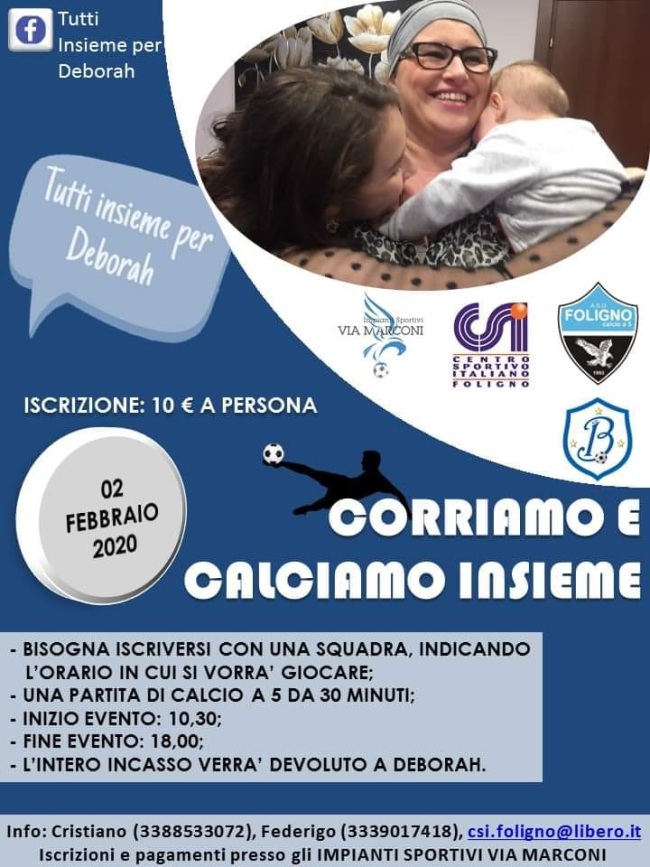 Si chiama “Corriamo e calciamo insieme” l’iniziativa promossa dagli Impianti Sportivi via Marconi, dal Centro Sportivo Italiano di Foligno in collaborazione con le società sportive Foligno calcio a 5 e Blasone per raccogliere offerte da destinare a Deborah Bonucci, la mamma di Sant’ Eraclio che ha bisogno di cure costose per curarsi. Poco meno di otto ore di calcio a 5 che vedranno alternarsi, sugli impianti sportivi di via Marconi squadre di calcio che potranno giocare partite di 30 minuti (due tempi da 15 minuti dirette da arbitri Csi. Bisogna iscriversi con una squadra (costo dell’iscrizione 10 euro a giocatore) indicando l’orario in cui si vorrà giocare per l’evento “Tutti insieme per Deborah” che inizierà domenica 2 febbraio alle 10.30 per terminare alle ore 18,3. L’intero incasso verrà devoluto alla giovane mamma. Già sono diverse le squadre che hanno aderito all’evento e che si sono iscritte per “correre, calciare insieme e aiutare Deborah”, ma i promotori ne attendono altre. “Siamo sicuri – spiega il presidente del Csi Foligno, Giovanni Noli – che il grande cuore degli sportivi si distinguerà ancora una volta, così come è accaduto per l’altra mamma, Pamela, bisognosa anche lei di cure costose. Quindi, spero che ancora in tanti risponderanno all’appello e si iscriveranno per aiutare Deborah”.