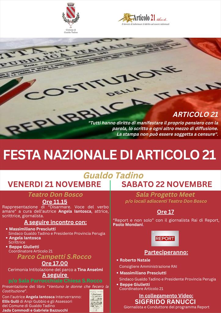 Si svolgerà a Gualdo Tadino il 21 e 22 novembre prossimi la Festa nazionale di Articolo 21 - Il dovere di informare, il diritto ad essere informati, un appuntamento dedicato alla libertà di espressione sancita dalla Costituzione italiana. Due giornate - venerdì 21 e sabato 22 novembre - ricche di eventi, incontri, spettacoli e testimonianze, per riflettere sul ruolo dell'informazione libera. La manifestazione - riferisce una nota del Comune - si aprirà venerdì 21 novembre alle ore 11.15 al Teatro Don Bosco con la rappresentazione "Disarmare. Voce del verbo amare" a cura dell'attrice, scrittrice e giornalista Angela Iantosca. Saranno presenti anche i ragazzi dell'Istituto Casimiri e dell'Istituto Comprensivo Gualdo Tadino-Casacastalda. Seguirà un confronto con Massimiliano Presciutti, sindaco di Gualdo Tadino e presidente della Provincia di Perugia, Angela Iantosca, scrittrice, Beppe Giulietti, coordinatore nazionale di Articolo 21. Nel pomeriggio, alle ore 17.00, si terrà la cerimonia di intitolazione del parco dei Campetti di S. Rocco a Tina Anselmi. A seguire, nella sala parrocchiale di S. Rocco, verrà presentato il libro "Ventuno le donne che fecero la Costituzione" con la partecipazione dell'autrice Angela Iantosca e di rappresentanti delle istituzioni e dell'Anpi. La giornata di sabato 22 novembre culminerà alle ore 17.00 nella sala Progetto Meet (adiacente al Teatro Don Bosco) con l'incontro "Report e non solo", che vedrà la partecipazione del giornalista Rai Paolo Mondani e, in collegamento online, di Sigfrido Ranucci, giornalista e conduttore del programma "Report". All'incontro parteciperanno inoltre Roberto Natale, consigliere di amministrazione Rai, Massimiliano Presciutti, Beppe Giulietti. "Questa Festa - sottolinea nella nota il sindaco Presciutti - è un momento di riflessione collettiva, ma anche di orgoglio civico. Avere ospite in collegamento Sigfrido Ranucci, una delle voci più autorevoli del giornalismo d'inchiesta italiano, significa ribadire con forza quanto siano fondamentali la verità, la democrazia e la libertà d'informazione. La sua partecipazione, insieme a quella di Angela Iantosca, di Paolo Mondani, di Roberto Natale, di Beppe Giulietti e degli altri ospiti, conferma l'importanza di questo appuntamento". "La Festa nazionale di Articolo 21 - sottolinea il Comune - rappresenta dunque un invito aperto a cittadini, studenti, associazioni e operatori dell'informazione a partecipare e condividere il senso più autentico dell'articolo 21 della nostra Costituzione: 'Tutti hanno diritto di manifestare liberamente il proprio pensiero con la parola, lo scritto e ogni altro mezzo di diffusione'".