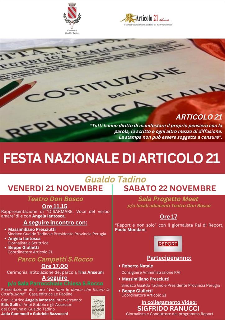 Il 21 e 22 novembre Gualdo Tadino diventerà una delle capitali della libertà di informazione grazie al festival promosso da Comune e associazione Articolo 21. Venerdì mattina alle 11, al Teatro Don Bosco, la rappresentazione di Angela Iantosca “Disarmare, voce del verbo amare”, lettura tratta dalle parole dei pontefici Francesco e Leone XIV, a cui seguirà l'incontro dell’autrice con ragazze e ragazzi del liceo scientifico "Casimiri". Sarà anche l’occasione per lanciare la campagna per il riconoscimento, da parte del Parlamento Europeo, della carta di Assisi che vede come primo firmatario Papa Francesco. Nel pomeriggio, alle 17.30, apertura dei giardini dedicati a Tina Anselmi, prima donna ministro della Repubblica, sempre dalla parte della Costituzione e contro i suoi nemici, a partire dalla loggia P2. A seguire, presentazione del libro di Angela Iantosca sulle madri costituenti con la presidente di Anpi Gubbio, Ellis Gulli. Sabato, alle 17 al Teatro Talia, “Report e non solo” con Paolo Mondani di Report, Roberto Natale, consigliere di amministrazione Rai, Massimiliano Presciutti, sindaco di Gualdo Tadino e presidente della Provincia di Perugia e il coordinatore di Articolo 21 Beppe Giulietti. Verrà inoltre esposto uno striscione con i nomi dei giornalisti palestinesi assassinati e ci sarà anche una specifica iniziativa per la liberazione di Alberto Trentini.
