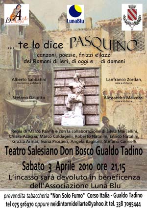 L'Associazione Culturale Arte&Dintorni in collaborazione del Comune di Gualdo Tadino presenta "Te lo dice Pasquino..." uno spettacolo che è nato da un'idea di Stefano Galiotto, Lanfranco Zordan, Alessandro Malvezzi, Maestro Alberto Sabbatini, regia Marco Panfili, scenografia Stefano Cannelli, Tecnici : Marco Coldagelli, Roberto Natalini, Graziella Armas, Angela Baglioni, Ivana Prosperi, partecipazione di Chiara Acaccia e Silvia Marcellini. "Pasquino ci conduce nella Roma di tutti i tempi attraverso la musica, canzoni e filastrocche che ci fanno rivivere la Roma più popolare e amata da molti cantanti, poeti e registi. Una cura particolare della scenografia, la scelta dei brani, delle immagini e delle filastrocche condite con momenti di cabaret che ricreano l'atmosfera della città eterna! ..". L'incasso della serata verrà devoluto all'Associazione LUNA BLU di Gualdo Tadino. L'appuntamento è per sabato 3 aprile presso Cinema Teatro Don Bosco a Gualdo Tadino, ore 21.15.