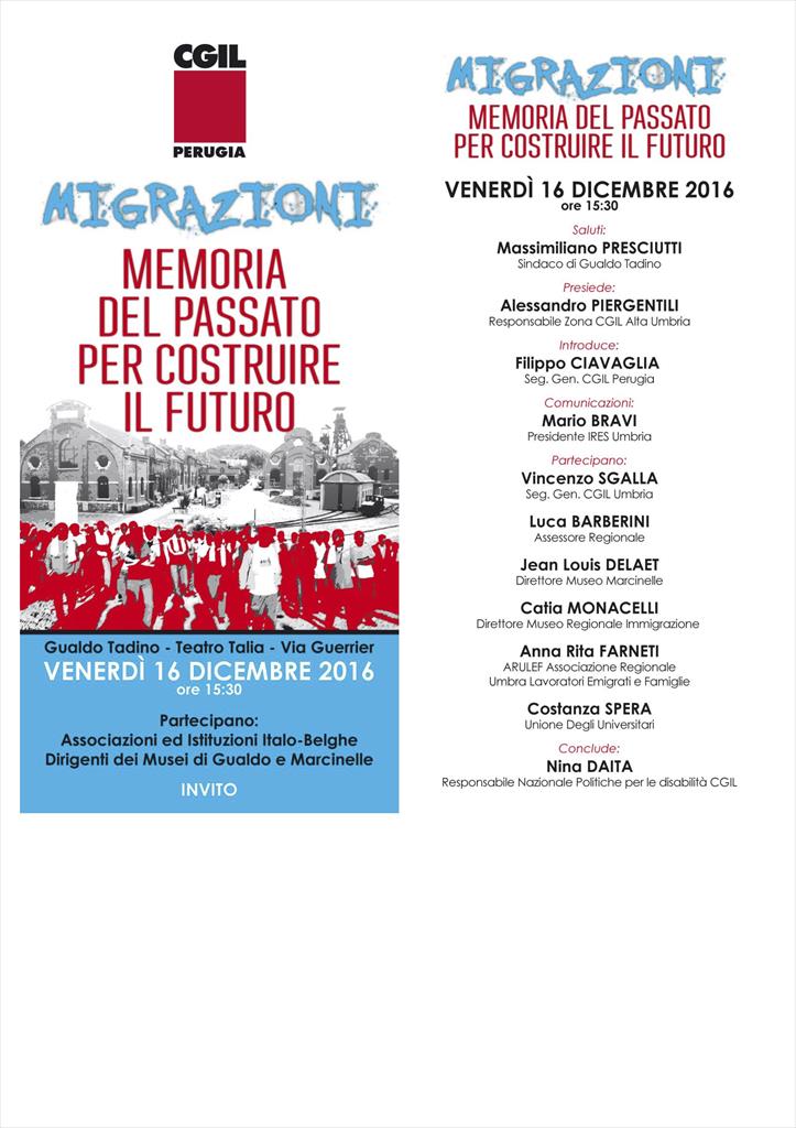 La conferenza dal titolo "Migrazioni: memoria del passato per costruire il futuro", è "un appuntamento fortemente voluto per continuare sul solco del dialogo con l’Europa che abbiamo tracciato in questi anni – spiega Filippo Ciavaglia, segretario generale della Cgil di Perugia – per questo abbiamo pensato di far incontrare due luoghi della memoria: il Museo Regionale dell’Immigrazione dell’Umbria e il Museo di Marcinelle, che conserva il ricordo di una delle più grandi stragi sul lavoro di migranti, quasi tutti italiani". Sarà infatti presente anche Jean Louis Delaet, attualmente presidente del museo belga; è infatti proprio a Marcinelle, nella miniera di carbone Bois du Cazier, che la mattina dell'8 agosto 1956 avvenne un grande incendio, che riempì di fumo tutto l'impianto sotterraneo, provocando la morte di 262 persone delle 274 presenti. Le vittime erano in gran parte emigranti italiani.