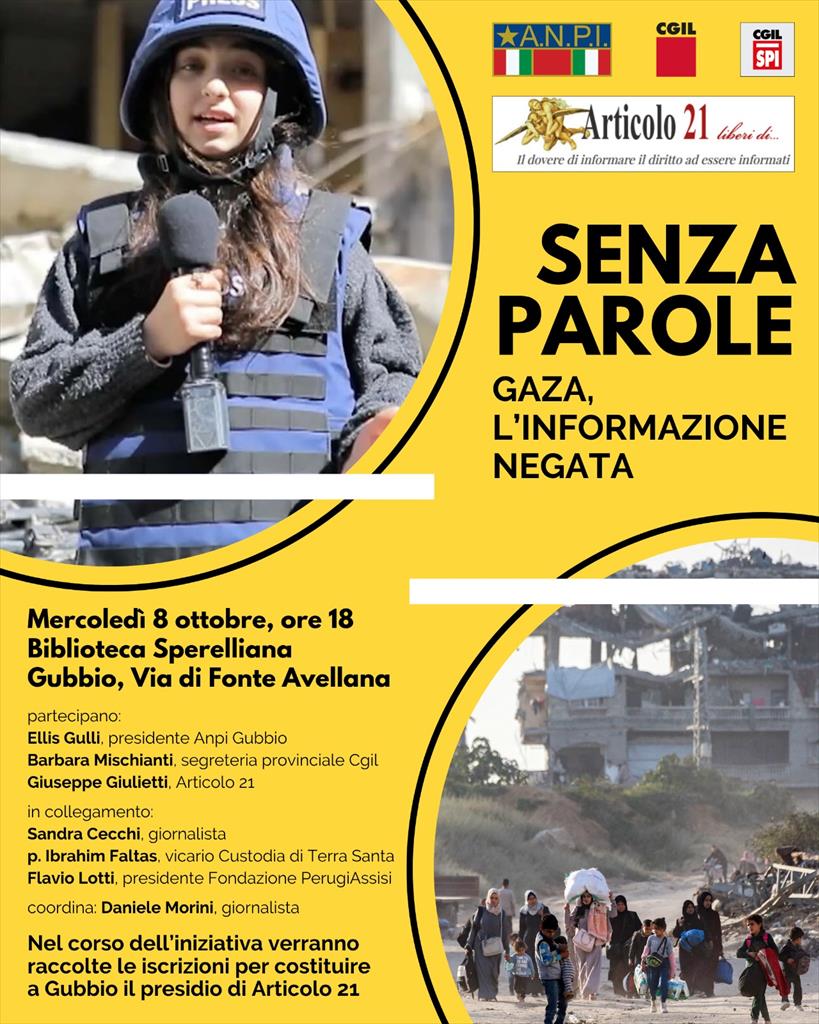 Più di 250 giornalisti uccisi in due anni, in media 11 al mese. Mai così tanti, in nessun altro conflitto. A cui si aggiunge il divieto d’ingresso per la stampa internazionale. Quello che sta succedendo a Gaza viene raccontato, tra mille rischi quotidiani, solo dagli operatori dell’informazione palestinesi che diventano voce, occhi e orecchie per i colleghi del resto del mondo, per i quali la Striscia è off limits. E devono fare non soltanto i reporter, ma spesso improvvisarsi anche soccorritori o infermieri. «Siamo esausti, sopraffatti, svuotati, siamo psicologicamente traumatizzati» diceva, qualche settimana fa, una giornalista “sul campo” in un’intervista al Manifesto. Di questo si parlerà l’8 ottobre alle 18 a Gubbio, all’ex Refettorio della Biblioteca Sperelliana, nell'incontro dal titolo: "Senza Parole. Gaza, l'informazione negata". Un’iniziativa di Anpi, Cgil, Spi e associazione Articolo 21. All’incontro, coordinato dal giornalista Daniele Morini, parteciperanno Ellis Gulli, presidente della sezione eugubina Anpi “Walkiria Terradura”, Barbara Mischianti della segreteria provinciale Cgil e Giuseppe Giulietti, coordinatore dei circoli di Articolo 21. In collegamento, la giornalista Sandra Cecchi, appena rientrata dalla Cisgiordania, Padre Ibrahim Faltas, vicario della Custodia di Terra Santa e Flavio Lotti, presidente della Fondazione PerugiAssisi. Nel corso dell’iniziativa verranno raccolte le iscrizioni per costituire anche a Gubbio il presidio dell’associazione Articolo 21.
