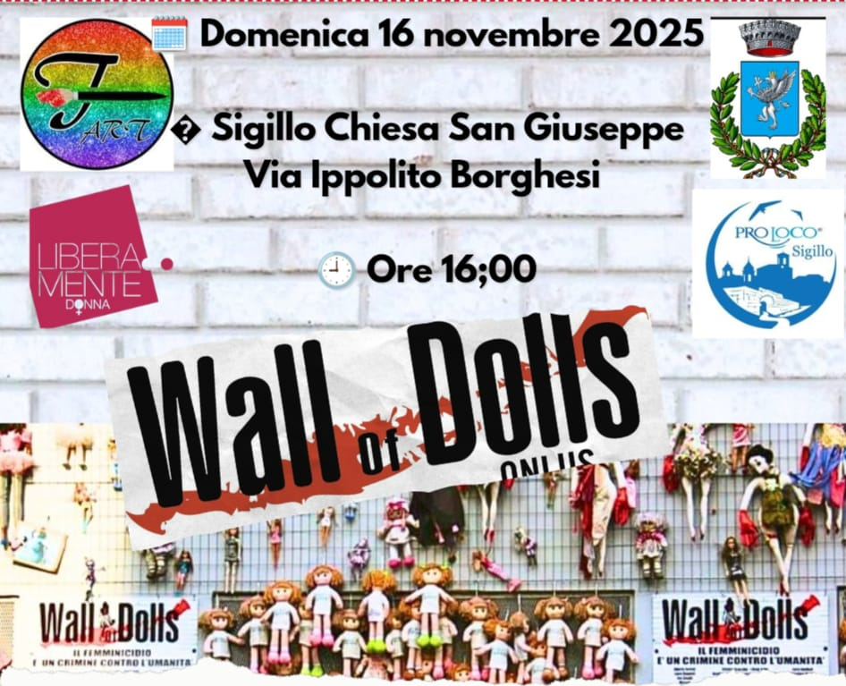 L’associazione FantasyArt, in collaborazione con la Proloco del comune di Sigillo, è promotrice dell’evento “Wall of Dolls”, un’importante iniziativa di sensibilizzazione e contrasto alla violenza sulle donne e di genere, che si terrà domenica 16 novembre 2025, a partire dalle ore 16, presso la Chiesa di San Giuseppe in via Ippolito Borghesi a Sigillo.