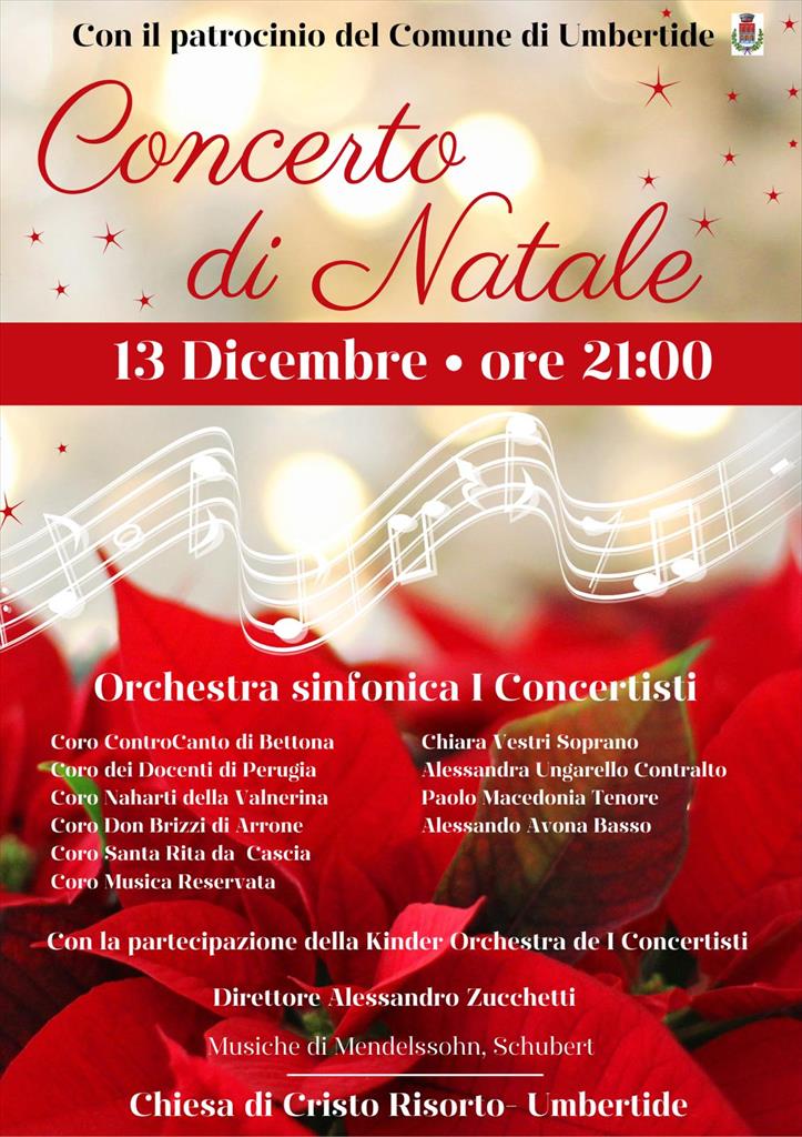 Con il patrocinio del Comune di Umbertide, sabato 13 dicembre, alle ore 21, presso la Chiesa di Cristo Risorto, andrà in scena il tradizionale concerto di Natale per Umbertide che vede coinvolta l'orchestra sinfonica I Concertisti di Umbertide firmata da 45 elementi, 5 cori Umbria e 4 solisti d'eccezione. Sarà eseguita la sinfonia n. 4 di F. MENDELSSOHN detta Italiana e il Magnificat di Schubert per soli, coro ed orchestra, direttore M° Alessandro Zucchetti. Ad aprire il concerto, come di consuetudine, i bambini della Kinder Orchestra de I Concertisti, 20 piccoli musicisti che vanno dai 6 ai 12 anni. Un grande evento organizzato dalla Scuola di musica I Concertisti convenzionata con il Conservatorio Luigi Cherubini di Firenze di cui è direttore il violinista M° Gianfranco Contadini.