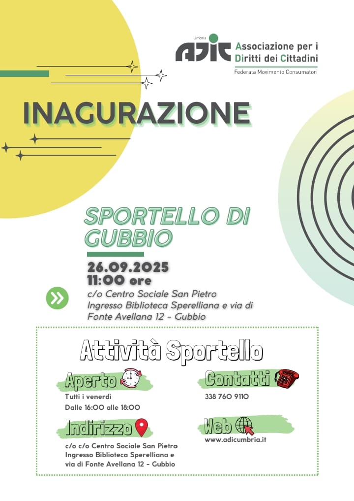 L'Associazione per i Diritti dei Cittadini (ADIC) continua la sua espansione in Umbria con l'apertura di un nuovo sportello a Gubbio che verrà inaugurato venerdì 26 settembre alle ore 11. Questo nuovo punto di riferimento sarà collocato nel Centro Sociale San Pietro, con ingresso dalla Biblioteca Sperelliana e via di Fonte Avellana 12. Il nuovo sportello si propone come un punto d'ascolto e di supporto per i cittadini eugubini. Offrirà consulenza gratuita e assistenza qualificata su diverse tematiche, come la tutela dei consumatori, i diritti legali e le questioni burocratiche. La capillarità di ADIC sul territorio rende questa associazione un importante presidio sociale, pensato per rendere più accessibile l'informazione e la protezione dei diritti individuali.