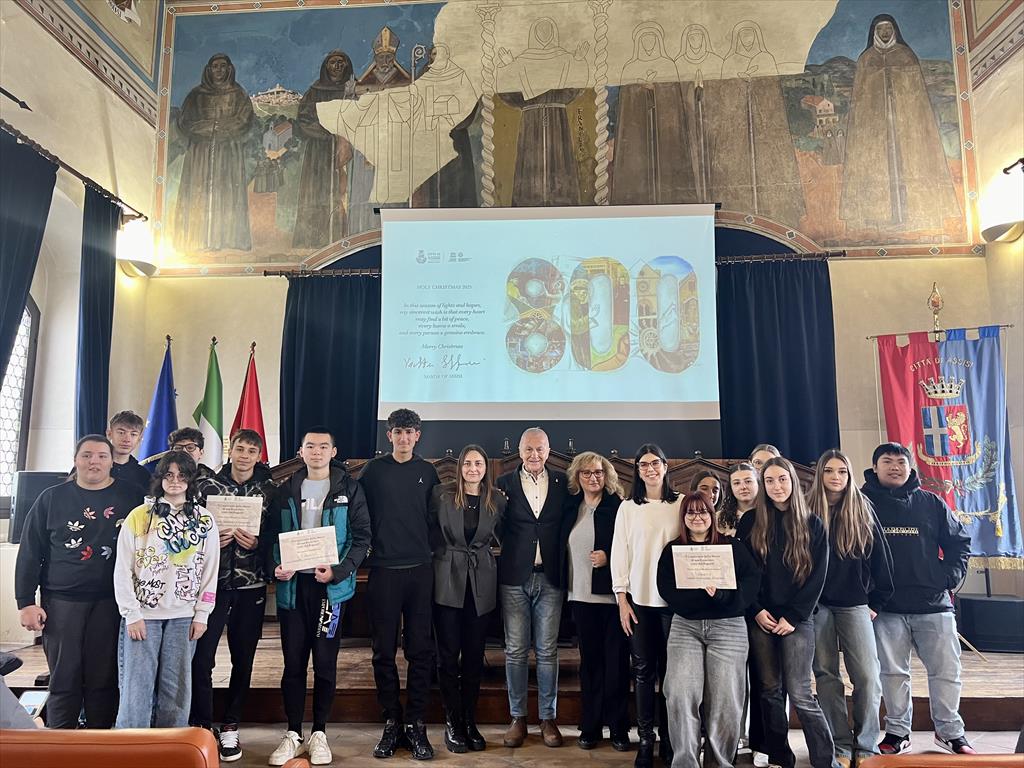 È andato alla 4ª/A del Liceo scientifico annesso al Convitto nazionale il primo premio del concorso di idee "Il centenario della morte di san Francesco visto dai ragazzi", indetto dal Comune di Assisi e rivolto alle scuole della città, per l'esecuzione di un progetto grafico finalizzato alla realizzazione del biglietto istituzionale per gli auguri di Natale 2025 e di Pasqua 2026, che sarà inviato ai governanti di tutti gli Stati del mondo, a firma del sindaco Valter Stoppini. La premiazione è avvenuta il 3 dicembre, nella Sala della Conciliazione, presenti il primo cittadino, la vicesindaca Veronica Cavallucci e l'assessora alla scuola Scilla Cavanna, che hanno incontrato e premiato gli studenti aderenti all'iniziativa, promossa per costruire la cultura del dialogo e della pace. In tutto - riferisce il Comune - sono stati presentati 18 progetti, selezionati da un'apposita commissione. "Un'iniziativa bella e importante - ha evidenziato il sindaco Valter Stoppini - nata con l'obiettivo di rendere i giovani protagonisti della vita della città, valorizzando i loro talenti. Loro sono il nostro futuro e tutte le istituzioni dovrebbero coinvolgerli di più, ascoltando la loro voce. Complimenti agli studenti e ai docenti che hanno aderito al progetto, che vuole trasmettere speranza al mondo". La classe vincitrice ha presentato un elaborato artistico dello studente Lorenzo Donnini: un collage e un chiaroscuro, con all'interno della scritta "800" dettagli di affreschi di Giotto presenti nella Basilica di San Francesco e dedicati alla vita del Poverello di Assisi prima e dopo la santità e scorci della basilica stessa, a significare quanto il santo abbia costruito e lasciato come messaggio. L'opera - frutto di "intelligenza naturale", senza l'utilizzo di quella artificiale - è stata riprodotta nel biglietto di auguri, con un pensiero a firma del sindaco: "In questo tempo di luci e speranze, il mio augurio più vero è che ogni cuore trovi un po' di pace, ogni casa un sorriso, ogni persona un abbraccio sincero. Buon Natale". Il secondo premio è andato alla 2ª/F sempre del Liceo scientifico annesso al Convitto nazionale, con un disegno di Zhou Guanhao che ha proposto la figura di un giovane San Francesco avvolta da una luminosa aureola a mosaico, con elementi che simboleggiano il messaggio di pace e speranza portato nel mondo santo di Assisi. Questo elaborato comporrà il biglietto con gli auguri di Pasqua, che sarà sempre inviato a tutti i Paesi. "Siate orgogliosi - ha detto Cavallucci - perché le vostre opere arriveranno ovunque e la nostra città parlerà al mondo attraverso la vostra creatività". Due ex aequo per il terzo posto: la classe "Laboratorio di scenografia" del Liceo scientifico annesso al Convitto nazionale e la classe 2ª/A dell'Istituto Professionale Alberghiero, con due disegni che hanno valorizzato la figura di San Francesco e simboli a lui cari. Alle classi vincitrici è andato un premio in denaro, da impiegare per attività didattiche. A tutti i partecipanti è stato consegnato un attestato di merito e tutti i lavori sono stati esposti in mostra, fino al 6 gennaio 2026, all'interno della Sala degli Stemmi del Palazzo comunale. "Scuole e studenti sono una grande risorsa proattiva per la città - ha sottolineato l'assessora Cavanna - e il Comune intende coinvolgerli sempre più nella vita cittadina. Oltre al Consiglio comunale dei ragazzi attivo già da tempo con allievi delle scuole medie, è infatti in cantiere l'idea di istituire un anche un Consiglio comunale dei giovani, con protagonisti studenti delle secondarie di secondo grado".