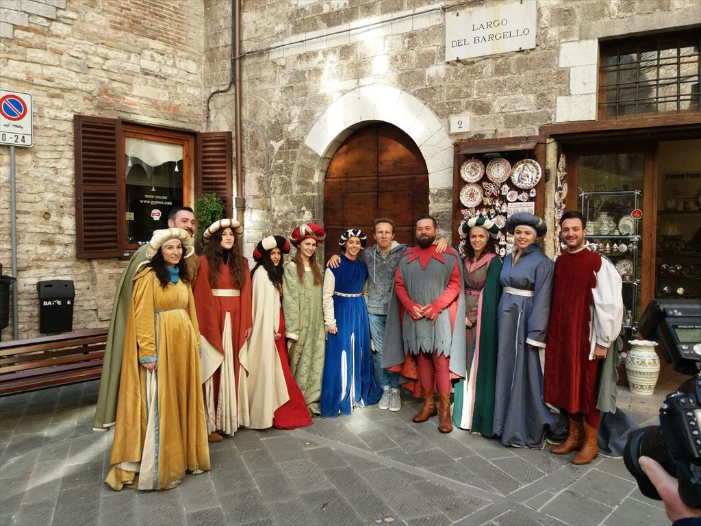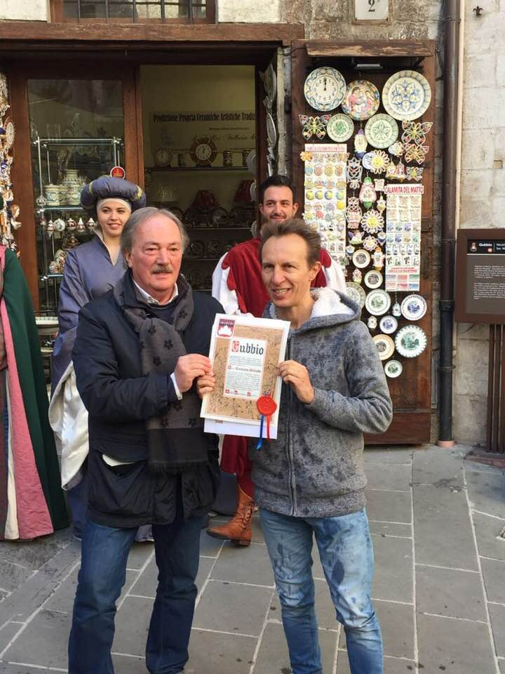Anche Cristiano Militello, popolare inviato di "Striscia la notizia", diventa "matto onorario": la cerimonia di "investitura" si è svolta stamane alle 12 intorno alla Fontana del Bargello, come tradizione. A consegnare la pergamena dopo la lettura delle motivazioni, e dopo gli immancabili 3 giri intorno alla fontana innaffiati d'acqua, è stato il presidente dell'associazione "Maggio Eugubino", Lucio Lupini (nella foto insieme a Militello). Un rito iniziatico in forma goliardica ma con una cornice ambientata nel Medioevo grazie ai figuranti dell'associazione quartiere di S.Pietro. A salutare l'arrivo a Gubbio dell'inviato di "Striscia", per una volta senza cameramen al seguito, anche il presidente della Famiglia dei ceraioli di San Giorgio, Vittorio Fiorucci. Stasera infatti proprio Militello sara' ospite al Veglione dei Sangiorgiari, primo appuntamento dei veglioni ceraioli di Carnevale.