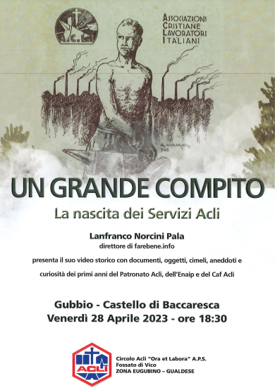 Venerdì 28 aprile presso il Castello di Baccaresca alle ore 14:30 in prima convocazione ed alle ore 17:30 in seconda convocazione, si terrà l’assemblea ordinaria dei soci del circolo Acli Ora et Labora di Fossato di Vico. Dopo la relazione del presidente Sante Pirrami sull’esercizio sociale 2022 e su altre importanti comunicazioni si terrà l’elezione della nuova presidenza che guiderà l’associazione per i prossimi tre anni. Un momento fondamentale per il futuro del circolo fossatano che vanta ormai oltre venti anni e che è diventato un importante punto di riferimento in tutto il territorio eugubino-gualdese. A seguire si terrà, a partire dalle ore 18:30, l’incontro con Lanfranco Norcini Pala direttore di farebene.info che presenterà il suo video storico: “Un grande compito, la nascita dei servizi Acli” che contiene: documenti, oggetti, cimeli, dei primi anni del patronato Acli, dell’Enaip e del Caf Acli. La nascita dei servizi Acli spiegati attraverso curiosità ed aneddoti dal giornalista marchigiano a lungo responsabile dell’ufficio comunicazione delle Acli e direttore del mensile “Azione sociale”. La giornata si concluderà con un piacevole momento conviviale. Chi vorrà partecipare alla cena è pregato di dare conferma entro il 26 aprile contattando la sede del circolo allo 075/919121 o tramite mail all’indirizzo comunica@aclifossato.eu.