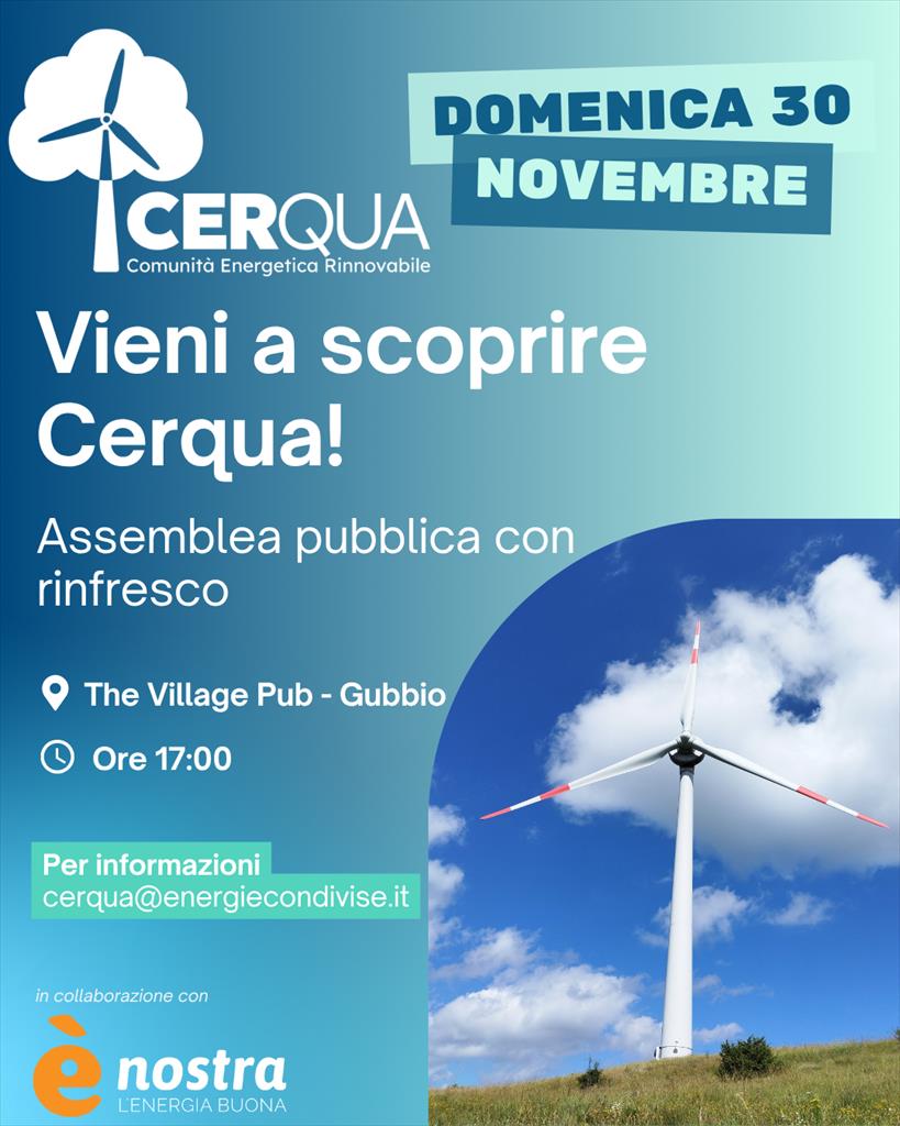 La Comunità Energetica Rinnovabile CERqua convoca cittadinanza, istituzioni e PMI del territorio all’assemblea pubblica di domenica 30 novembre alle 17:00 al pub The Village di Piazza Quaranta Martiri 29, Gubbio.
