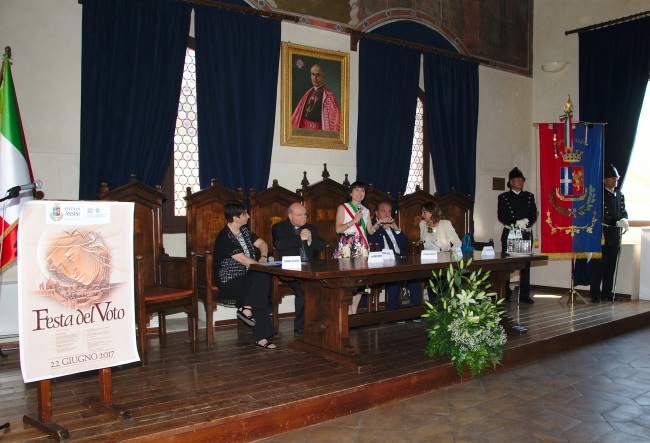 La Città di Assisi si appresta a vivere la Festa del Voto che, come di consueto, verrà celebrata nella giornata del 22 giugno nel ricordo della liberazione della città di Assisi dall’assedio delle truppe imperiali – di cui facevano parte anche truppe saracene - durante la fase più accesa del conflitto contro la sede Apostolica, grazie alla potente preghiera di intercessione di Santa Chiara. La Festa del Voto è stata reintrodotta dal 1933 da Arnaldo Fortini e, da allora, ha costantemente mantenuto nell’organizzazione, sia del Comune che delle Autorità religiose locali che congiuntamente hanno di volta in volta condiviso programmi e azioni. “La Festa del Voto è una delle tradizioni identitarie di Assisi, in cui la Città si ritrova con la sua Santa Chiara, ricordando la propria storia, ma soprattutto facendo vivere i valori francescani “ ha affermato il Sindaco di Assisi Stefania Proietti “Anche quando tutto sembra perduto, la fede, l’umile preghiera di Chiara consentirono la liberazione della Città e di tutta la sua popolazione dal pericolo imminente della guerra, che avrebbe portato morte e sofferenza. E’ commovente riflettere, anche in questa occasione, su quanto amore i nostri Santi Francesco e Chiara, abbiano sempre manifestato nei confronti della loro Città. Oggi come allora il loro esempio ci guidi verso un autentico spirito cristiano che metta al primo posto, sempre e in ogni contesto, la fraternità e l’umanità, l’accoglienza e la carità nei confronti di chi è il più povero, debole e oppresso.” L’edizione 2018, per volere e con il supporto dell’Amministrazione Comunale, si è aperta con una interessante iniziativa coordinata dall’Associazione Guide Turistiche dell’Umbria, tenutasi nei giorni 16 e 17 giugno presso Sant’Angelo in Panzo come anteprima alla Festa del Voto. “Chiara e Agnese sorgente di Fede a Sant' Angelo in Panzo – dichiara Maddalena D’Amico Presidente dell’Associazione G.T.U. – ha rappresentato un momento di grande partecipazione spirituale e popolare al tempo stesso in quanto l’itinerario storico drammatizzato e sceneggiato volto a ricordare i passi mossi dalle sorelle Santa Chiara e Agnese alla sequela del Vangelo, prima del definitivo trasferimento a San Damiano, ha voluto far immergere i partecipanti nell’atmosfera originaria in cui le due sorelle vissero quei momenti unici e indelebili per la loro e la nostra storia”. La rappresentazione, nell’ambito del progetto Assisi Rinnovata, curata da Commedia Harmonica in collaborazione con la Parrocchia di San Rufino e con la famiglia Marconi, è stata realizzata in collaborazione con l’Amministrazione Comunale che ha visto la partecipazione di circa 200 persone ed è stata l'occasione per valorizzare i luoghi, le memorie e le tradizioni legate alla storia della Città di Assisi. Per la giornata del 22 giugno il programma prevede alle ore 5.45 in piazza del Comune, il suggestivo Inno di Assisi eseguito dagli Araldi con Chiarine dal Palazzo Comunale, seguito alle ore 6.00 dal Suono a festa della campana delle Laudi e delle altre campane della Città per ricordare la liberazione di Assisi. In serata, presso la piazza di San Rufino, alle ore 20.30 il corteo religioso partirà per la solenne processione per unirsi, in Piazza del Comune, a quello civile dove avrà luogo la “Lettura dell’Ordinanza del Consiglio Comunale con cui il 26 maggio 1644 veniva istituita la “Festa del Voto” con il saluto del Sindaco; alle ore 20.45 alla Basilica di S. Chiara si terrà il “Saluto delle Sorelle Clarisse e l’Omaggio floreale del Sindaco”, a seguire presso il Santuario di S. Damiano, l’Offerta dei ceri da parte del Sindaco, la Celebrazione di Compieta e l’Esortazione del Vescovo con il consueto saluto del Ministro Provinciale dei Frati Minori dell’Umbria e Sardegna.