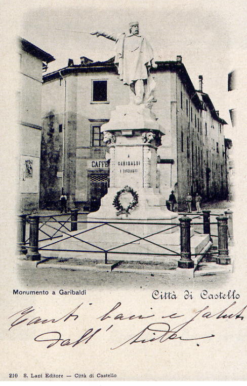 Fu inaugurato a Città di Castello la mattina di domenica 3 luglio 1887 nell’allora Piazza della Stazione, raccontano le cronache dell’epoca. L’inaugurazione riuscì superiore ad ogni più ottimistica previsione, fin dalle prime ore del mattina un gran numero di cittadini occupava la piazza della stazione. I treni di passeggeri erano accolti dal suono della banda cittadina. Si formò un corteo che da Porta Santa Maria imboccò il corso pavesato a festa con tante bandiere che sventolavano dalla finestre gremite di persone. Arrivati in Piazza Garibaldi, oggi Piazza Gabriotti, il lunghissimo corteo si avviò alla piazza del monumento. Qui giunte, le autorità presero posto al centro. Circa 600 erano i forestieri, presenti per tutte le associazioni cittadine. La piazza, come tutte le vie del centro, era addobbata da fiori e bandiere. Alle 11.30 avvenne lo scoprimento della statua. Le sembianze dell’eroe sono salutate dal suono di sette bande riunite. Commozione generale. Parlò Giuseppe Nicasi, che, fra l’altro, disse: “Nessun altro posto poteva essere migliore di questo: tra le rovine di un convento di gesuiti (oggi sede del Monte dei Paschi) e in faccia al Palazzo che fu dei Vitelli”.