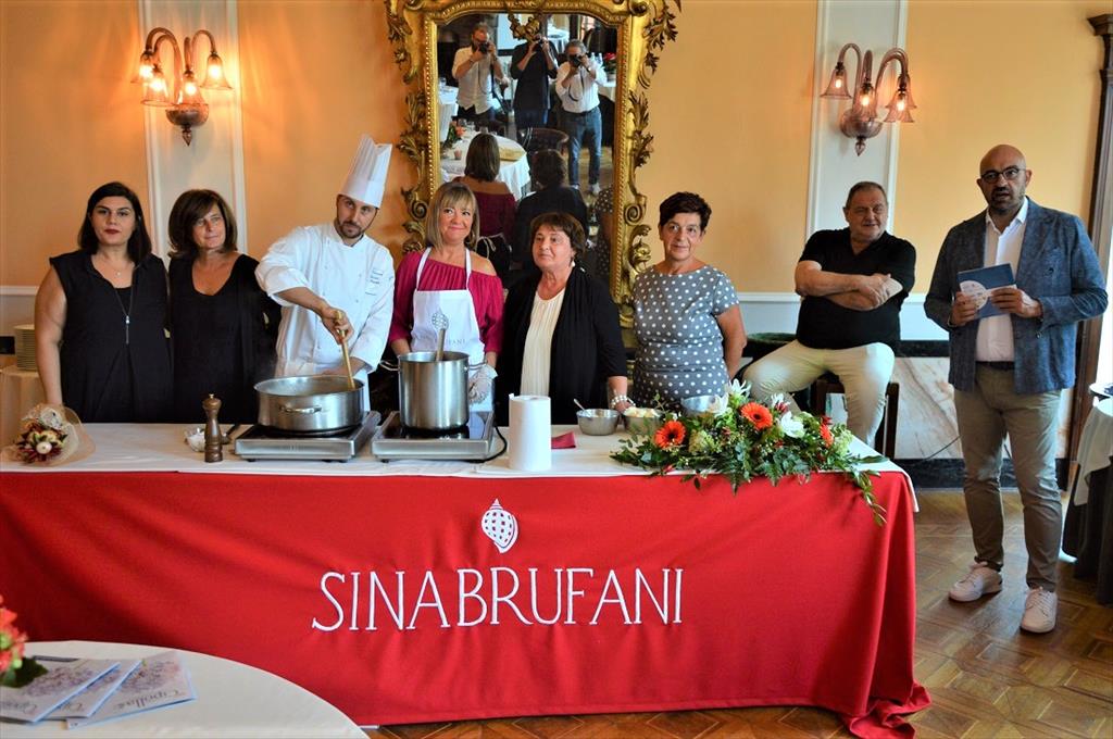 La 39esima Festa della cipolla di Cannara è ormai alle porte e tutto è pronto per accogliere al meglio le oltre 70mila persone che, come ogni anno, in meno di due settimane, si riversano nel borgo umbro per assaporare la dolcezza unica di questo eccellente prodotto della campagna umbra. La dolcezza è, infatti, la peculiarità distintiva della cipolla di Cannara come ha più volte sottolineato lo chef Gianfranco Vissani che da alcuni anni collabora con la manifestazione ideando i piatti dello stand gastronomico ‘Al cortile antico’, uno dei sei dislocati nel centro storico della città, accanto a ‘El cipollaro’, ‘Il giardino fiorito’, ‘La taverna del castello’, ‘La locanda del curato’ e ‘Il rifugio del cacciatore’. E proprio con un dessert, la cassata con canditura di cipolla, si è voluto presentare al pubblico l’evento cannarese più atteso dai buongustai, in programma quest’anno da martedì 3 a domenica 15 settembre, con pausa lunedì 9. Uno show cooking diretto dallo stesso Vissani ha, infatti, aperto la conferenza stampa di venerdì 30 agosto, all’hotel Sina Brufani di Perugia, con cui gli organizzatori hanno illustrato il programma della Festa della cipolla di Cannara. Presenti anche il presidente dell’Ente Festa della cipolla Roberto Damaschi, il sindaco di Cannara Fabrizio Gareggia, gli assessori comunali Luna Stoppini e Silvana Pantaleoni, la presidente dell’Assemblea legislativa dell’Umbria Donatella Porzi e l’assessore regionale Fernanda Cecchini. “Non voglio anticipare molto – ha esordito Vissani –, ma intanto voglio farvi assaggiare la fregola al ragù di Chianina risaltata con cipolla. La cipolla, alla fine, è un prodotto semplice ma bisogna saperla trattare. La possiamo fare ripiena, sotto la cenere, come la faceva mio padre tanti anni fa, o anche semplicemente condita con olio umbro, mentuccia e una bella insalata”. C’è quindi grande innovazione a Cannara ma anche tanta tradizione come dimostrano i piatti tutt’ora più in voga come la pizza con la cipolla e le penne alla cipollara, una gricia con abbondante cipolla. “La nostra è molto più di una sagra – ha spiegato Damaschi –. Accanto a una cucina di ormai rinomatissima, cerchiamo, infatti, di proporre un calendario veramente ricco di eventi, cultura e serate di grande qualità. E tutto questo importante lavoro deve servire innanzitutto a valorizzare Cannara e il suo territorio. In questo senso bisogna inquadrare anche la scelta radicale di intraprendere la strada dell’ecosostenibilità: tranne le bottiglie dell’acqua, che per le normative vigenti non possono essere di vetro, tutto è riciclabile o biodegradabile”. Oltre alla mostra mercato nei vari angoli del paese, ogni sera si svolgono spettacoli musicali e di danza e si esibiscono noti comici e personaggi dello spettacolo come Massimo Bagnato e il mago illusionista Andrea Paris. Da segnalare, inoltre, domenica 8 settembre, il 2° memorial ‘Valter Baldaccini’, gara podistica già molto conosciuta in ambito sportivo, e domenica 15 settembre, un raduno storico di Alfa Romeo, con già 250 iscritti, e un’infiorata di autunno per le strade della città. Cannara e i suoi 4mila abitanti sono, insomma, tutti mobilitati in questi giorni di festa. “C’è l’impegno di tutta una comunità, tant’è che abbiamo oltre 600 volontari al lavoro ogni giorno – ha ricordato il sindaco Gareggia –. A fare la differenza è sicuramente questa dedizione, la grande cura dei dettagli e della qualità. ma anche un territorio fantastico”. “La Festa della cipolla – ha concluso Cecchini – è un momento importante dal punto di vista turistico e della promozione, non solo per Cannara ma per tutta l’Umbria” La Festa della cipolla di Cannara è sostenuta dal Gal Valle umbra e Sibillini.