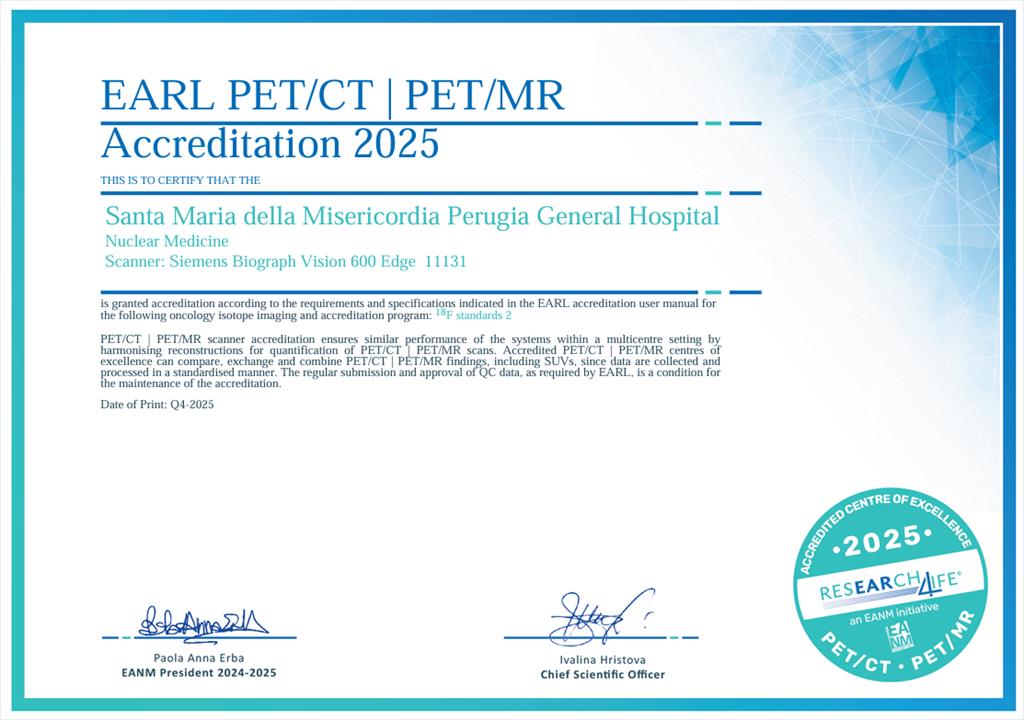 L'apparecchiatura Pet-Tc, in dotazione presso la Medicina nucleare dell'ospedale di Perugia, diretta da Massimo Eugenio Dottorini, ha ottenuto la certificazione d'eccellenza "Earl" (Eanm Research GmbH) della European Association of Nuclear Medicine. "L'accreditamento Earl rappresenta una garanzia di eccellenza e determina significativi vantaggi per la struttura e i pazienti - specifica Dottorini in una nota dell'azienda ospedaliera - come ad esempio il controllo di qualità esterno riconosciuto dall'organismo di accreditamento europeo e la possibilità di comparare di dati semiquantitativi con indagini effettuate in tempi diversi o in altri centri accreditati. Questo assicura un'eccellente qualità nella pratica clinica quotidiana". "Inoltre, - continua - l'accreditamento Earl è prerequisito essenziale per la partecipazione a trial clinici multicentrici di ricerca oncologica, aprendo nuove opportunità per il nostro Centro di contribuire a studi di rilevanza internazionale". Il conseguimento di questo traguardo - spiega l'ospedale - è stato reso possibile grazie alla stretta collaborazione multidisciplinare tra il personale medico e tecnico sanitario della Medicina nucleare, del servizio di Fisica sanitaria, diretto da Roberto Tarducci, e degli uffici di qualità e coordinamento amministrativo, che hanno gestito le complesse pratiche burocratiche necessarie per l'accreditamento. In Italia, ad oggi, sono accreditati solo 15 centri Earl, tra cui i prestigiosi centri Pet del San Raffaele, Humanitas, Ieo, Niguarda, Istituto Tumori di Milano, Policlinico Gemelli, ospedale Bambin Gesù, Irmet Torino, Irst Meldola, Careggi Firenze, Pisa, Bergamo, Genova, Reggio Emilia, Parma e Milano Bicocca. L'ospedale Santa Maria della Misericordia di Perugia entra a far parte di questo ristretto gruppo di eccellenza, rappresentando per l'Umbria e per il territorio un centro di riferimento per le indagini diagnostiche oncologiche ad altissima qualità. "Un riconoscimento di prestigio - ha commentato il direttore generale Antonio D'Urso - che testimonia la responsabilità dell'azienda ospedaliera nell'assicurare i massimi standard qualitativi nella pratica diagnostica e nella ricerca oncologica. Questa certificazione rappresenta un impegno concreto verso l'eccellenza clinica e la ricerca, garantendo ai pazienti oncologici una diagnostica ai più alti livelli internazionali di qualità e rafforzando il posizionamento del nostro centro nel panorama nazionale e internazionale".