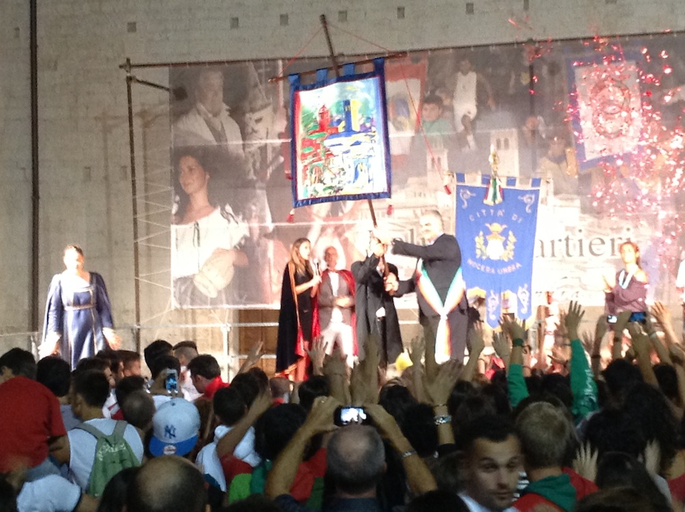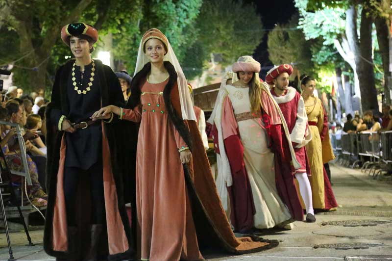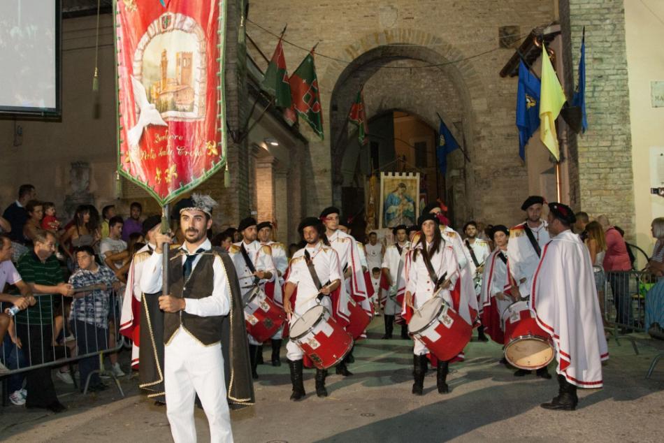 Nocera Umbra sta per tingersi di rosso-verde e giallo-blu, i colori dei due contendenti del Palio dei Quartieri. Dal 31 luglio al 6 agosto, infatti, si daranno battaglia i due quartieri Porta Santa Croce e Borgo San Martino. La rievocazione storica si aprirà lunedì 31 luglio con la cerimonia inaugurale di piazza Caprera, alle 21, alla quale quest’anno parteciperanno le delegazioni di alcune manifestazioni storiche vicine. Ospite d’eccezione della serata sarà il giornalista Michele Cucuzza, condutture storico de La vita in diretta e di Uno mattina. Con lui sul palco Alessio La Padula, vincitore dell’edizione 2016 del programma televisivo Amici di Maria De Filippi, e la ballerina nocerina Francesca Bazzucchi, che ha lavorato con Laura Pausini, Lorella Cuccarini e Heather Parisi. Come tradizione, non mancheranno la lettura del bando e l’esecuzione dell’inno del Palio “Aria di festa” da parte della Corale “Santa Cecilia” di Nocera Umbra. Martedì 1 agosto si torna in dietro nel tempo con i cortei storici dei quartieri Porta Santa Croce, il cui periodo di riferimento va dal 1820 al 1920, e di Borgo San Martino, con la sua ambientazione dal 1350 al 1450. I figuranti in abiti d’epoca sfileranno alle 21 in piazza Umberto I e in piazza Medaglie d’oro, uscendo da Porta San Francesco. Attesa novità di quest’anno sarà quella del tema unico per entrambi i quartieri che, vista la ricorrenza nel 2017 dell’ottavo centenario dalla morte del patrono di Nocera, San Rinaldo, dovranno rendere omaggio al protettore della città nelle proprie rievocazioni, mettendo in mostra il contesto storico, culturale e religioso di Nocera, dando anche sfogo alla propria creatività. Ancora un salto nel passato, ma stavolta con il coinvolgimento dell’intero centro storico, nelle serate di mercoledì 2 agosto e giovedì 3 agosto, quando San Martino e Santa Croce si sfideranno a colpi di allestimenti teatrali e rievocazioni storiche con tanto di cena d’epoca. I due quartieri, ognuno nella propria parte, riporteranno il centro storico per due sere di fila alle atmosfere del Medioevo e dell’Ottocento, con scene teatrali e spaccati di vita delle due diverse epoche storiche. Fra le novità di quest’anno, oltre alla contemporaneità dello svolgimento degli allestimenti teatrali, anche il passaggio della giuria a sorpresa tra il pubblico, per garantire una sempre maggiore imparzialità. Inoltre, ci sarà una nuova sfida “fuori punteggio”: il Palio degli arcieri, che si disputerà nella serata di venerdì 4 agosto in piazza Caprera. Una nuova competizione, dunque, il cui punteggio, però, non andrà a sommarsi a quello di cortei storici, animazioni teatrali e cene d’epoca, che per tradizione decretano il vincitore del Premio speciale, che verrà assegnato da una giuria di esperti sabato 5 agosto. La consegna, come ogni anno, avverrà a piazza Caprera a mezzanotte. Novità, il Premio speciale contribuirà con un proprio punteggio all’assegnazione del Palio 2017. Giornata conclusiva e di grandi sfide, quella di domenica 6 agosto. Alle 21 inizia la battaglia “sportiva” con le gare della Dama infedele, ispirata nel nome a un reale fatto di sangue del 1421, quando il tradimento della moglie del castellano di Nocera portò a vendette e uccisioni. Queste competizioni sono la gara della staffetta, sfida atletica divisa in tratti, e quella della portantina. Unica nel suo genere, quest’ultima, con quattro atleti per quartiere che portano in spalla un loro compagno, il Priore, seduto su una portantina di legno. Gli atleti saliranno fino alla parte più alta del centro storico e dopo ogni tratto di gara i vincitori sceglieranno una dama che porta una brocca sigillata con all’interno un fazzolettone. Se i colori del fazzoletto saranno quelli del proprio quartiere, al rione vincitore verrà assegnato un punto aggiuntivo; se i colori saranno quelli dell’avversario, il punto andrà al rivale e la dama sarà stata “infedele”. Il totale dei punteggi delle gare, insieme a quelli del Premio speciale, decreteranno il vincitore del Palio 2017, che verrà consegnato dall’Ente palio domenica sera in piazza Caprera.