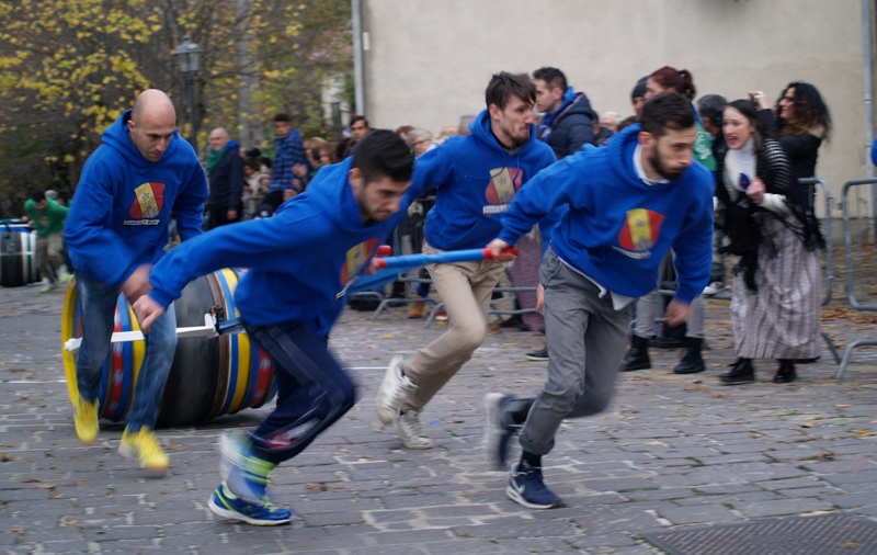 Ci sono volute alcune ore per l'Associazione Corsa delle Botti, che cura ed organizza la manifestazione, per confermare e validare l'edizione 2016 della Corsa delle Botti, una gara che tra le immancabili polemiche, ha scritto sicuramente un capitolo inedito nella storia della Festa. Ma andiamo con ordine. Sabato sera è toccato all'Hostaria de la Rocca aprire i festeggiamenti presso la frazione di Villa Col de' Canali, dove con castagne e vino novello le due squadre hanno ballato fino a notte fonda, nonostante la temperatura e la cima innevata del Cucco. Domenica mattina sono stati i Tamburini di Costacciaro a svegliare i due capobottatoli Dario Bei per le frazioni e Piero Bucciarelli per il capoluogo e ad aprire il suggestivo Mercatino dell'Artigianato all'interno del ritrovato Palazzo Ducale. Dopo il pranzo alle rispettive taverne e la visita al cimitero comunale, il centro storico è stato invaso dalle due squadre e dal ricco corteo che ha percorso le vie della città accompagnato dal singolare suono dei Tamburini di Costacciaro e Fossato di Vico. Il corteo è proseguito verso la chiesa di San Francesco dove le botti sono state benedette dal parroco Don Ferdinando, per poi terminare alla piazza del Monumento dove era stata organizzata anche un'esibizione di balli popolari. Poi la gara: l'ordine di partenza ha visto nella prima manche la squadra della Porta in prima posizione, mentre quella della Rocca nella seconda. Nel primo giro i quaranta bottaioli si sono succeduti lungo i 650 metri di percorso, tra curve, discese e salite, arrivando al traguardo a pochi secondi di distanza. La seconda manche, quella decisiva, ha invece visto accadere il famoso sorpasso. Stando ai video, che l'Associazione ha voluto vedere più volte anche in questi giorni per poter confermare il risultato, la gara sarebbe andata così: partenza regolare per entrambe le squadre che hanno iniziato la gara lungo il Corso, alla curva della Torre dell'Orologio però, la botte delle frazioni ha preso un'altra direzione, capovolgendosi su un lato e andando fuori percorso. Dopo il repentino recupero ha quindi continuato la gara ma, nel successivo cambio qualcosa è andato storto causando la caduta del timone. Proprio in questo momento, anche per evitare di causare incidenti, la squadra del capoluogo avrebbe fatto il sorpasso. Lo stupore della folla all'arrivo è stato quindi inevitabile e tra chi invocava il regolamento e chi festeggiava, la premiazione è stata ritardata. Il regolamento. E' stato necessario sfogliare il regolamento della Corsa, quello che dal 2009 i ragazzi hanno riscritto per cercare di regolarizzare tutta la manifestazione nel pieno rispetto della tradizione e della sicurezza. Come illustrato dall'attuale presidente dell'Associazione Giulia De Montis, l'articolo 47 dice che "Il regolamento di gara ammette il sorpasso, purché vi siano condizioni di sicurezza idonee da garantire l’incolumità di persone e cose". La premiazione è quindi proseguita con la consegna del trofeo al capobottaiolo dell'Hostaria de la Porta Piero Bucciarelli: "Grazie a tutti per l'impegno, all'Associazione che ogni anno organizza la Corsa e alla mia squadra che in questi ultimi due anni ha segnato la storia: il record e il primo sorpasso. Ci vediamo il prossimo anno, anche con un piccolo bambino!" e con l'invito del parroco e del sindaco di Costacciaro a vivere questo evento come un momento di unione collettivo.