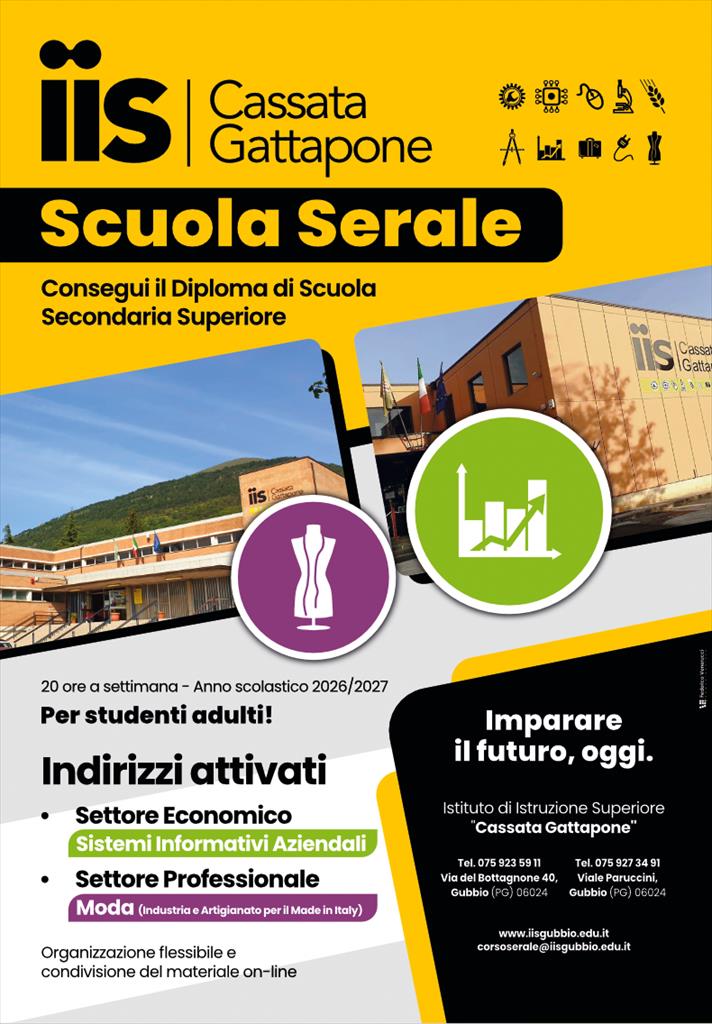 L’Istituto “Cassata-Gattapone” di Gubbio rinnova e consolida la propria proposta formativa per l’anno scolastico 2026/27, confermando i corsi serali come un punto di riferimento per l’istruzione degli adulti e per tutti coloro che desiderano conseguire il diploma di Scuola Secondaria di Secondo Grado. Si rafforza dunque un’offerta che negli anni ha saputo intercettare le esigenze del territorio, con percorsi ormai strutturati e riconosciuti sia nel settore Moda sia in quello Economico. I risultati conseguiti confermano la validità del progetto: nei due anni precedenti sono stati circa 30 gli studenti dei corsi serali che hanno raggiunto il diploma, mentre nel corrente anno scolastico saranno 15 i candidati pronti ad affrontare l’esame di Stato. I percorsi attivati rispondono in modo concreto alle richieste del tessuto produttivo locale, offrendo competenze aggiornate e spendibili in diversi ambiti professionali, dalla creatività e produzione del settore moda fino alla gestione aziendale e ai sistemi informativi. I corsi serali dell’istituto eugubino si distinguono per una struttura flessibile, pensata in particolare per studenti lavoratori e adulti che desiderano rimettersi in gioco. L’organizzazione prevede modalità didattiche modulari e l’integrazione di strumenti digitali, con la possibilità di seguire il venerdì a distanza. Particolare attenzione è inoltre riservata alla valorizzazione delle esperienze pregresse, attraverso il riconoscimento di crediti formativi, e al supporto costante da parte dei docenti. Le iscrizioni sono già aperte. Per informazioni è possibile consultare il sito dell’Istituto www.iisgubbio.edu.it, contattare la segreteria via email all’indirizzo corsoserale@iisgubbio.edu.it, telefonare al numero 0759235911 oppure recarsi direttamente presso la sede di Via del Bottagnone, 40. E’ possibile effettuare la preiscrizione online al seguente link per essere richiamati dalla scuola: https://forms.gle/UdMPvL5vT4qSw9Cm6