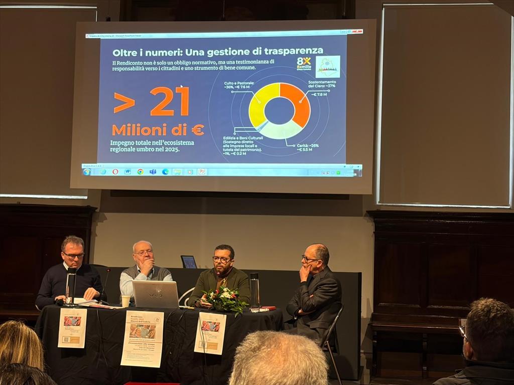 Ha sfiorato i 21 milioni di euro, 20.977.747 per la precisione, l'impegno complessivo sostenuto nel 2025 nelle otto diocesi dell'Umbria attraverso i fondi dell'8xmille. Nel 2024 il totale generale ammontava a 21.999.005 milioni di euro. I numeri emergono dal Rendiconto regionale 2025, documento arrivato alla nona edizione e che illustra l'impiego delle risorse provenienti dalla firma dei contribuenti a favore della Chiesa cattolica, presentato questa mattina nella sala del Dottorato nel complesso della Cattedrale di Perugia. Per l'arcivescovo di Perugia-Città della Pieve Ivan Maffeis "il Rendiconto di quest'anno in realtà sembra segni una piccola inversione di tendenza". "D'altra parte, insieme alla gratitudine per chi firma per destinare i fondi alla Chiesa cattolica, dobbiamo riconoscere che è una società diversa da quella di ieri, che non vuol dire che non apprezzi l'intervento della Chiesa però forse è anche più distratta", ha aggiunto monsignor Maffeis a margine della presentazione del rapporto. Tra gli interventi, quello di Giovanni Lolli, diacono coordinatore della commissione regionale per il sostegno alla Chiesa cattolica. "I fondi che arrivano alle diocesi dell'Umbria sono rimasti pressoché gli stessi, il calo è imputabile all'edilizia di culto che varia ogni anno a seconda delle opere finanziate". L'Umbria dunque "non risente" del calo generale dell'8xmille. "Sono tantissime le opere che realizziamo anche nel sociale, quest'anno prendiamo in esame la situazione degli anziani su cui la chiesa si è sempre spesa". L'edizione 2025 del Rendiconto è infatti dedicata al tema "Nel cuore della Chiesa gli anziani e i deboli". Il Rendiconto entra nel dettaglio degli ambiti di impiego dei fondi. Poco più di 4,2 milioni sono stati impiegati per attività di culto e pastorale, mentre 3,8 per interventi caritativi nelle comunità. Ammonta invece a 4,4 il totale destinato a edilizia di culto e beni culturali. L'arcivescovo Maffeis proprio su questo capitolo ha voluto ricordare l'imminente avvio dei lavori alla chiesa di Pierantonio. "Abbiamo celebrato nei giorni scorsi il terzo anniversario dal sisma che colpì la zona. I lavori alla chiesa partiranno tra fine aprile e inizio maggio, sono interamente finanziati dall'8xmille". Tra le voci di spesa del Rendiconto "che dà conto di tanti progetti" che spaziano tra l'educazione dei ragazzi, cura degli anziani e carità, ci sono anche 8,6 milioni per il sostentamento di oltre 630 sacerdoti dell'Umbria. "Il rendiconto è un obbligo normativo ma da nove anni l'abbiamo fatto diventare un elemento di trasparenza e comunicazione importante a livello regionale". Lo ha spiegato Daniele Fiorelli, economo della Ceu, sottolineando che i fondi 8xmille sono "un volano capace di attivare collaborazioni". La quota 2025, è spiegato nel rapporto, deriva dal gettito Irpef 2021 e dalle scelte compiute dagli italiani nel 2022. I fondi, infatti, vengono erogati tre anni dopo rispetto alle dichiarazioni dei redditi.