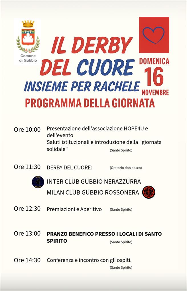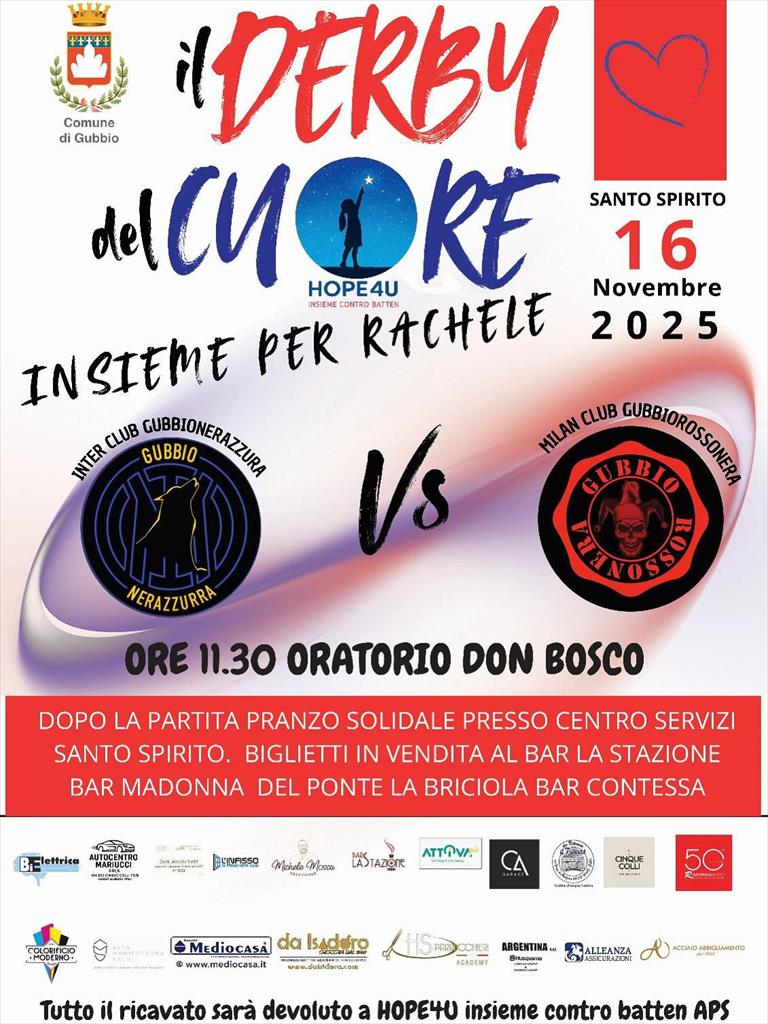 In campo tra colori rossoneri e nerazzurri per tifare tutti insieme rachele. Il Milan Club Gubbio Rossonera e l'Inter Club Gubbio Nerazzurra promuovono con il patrocinio del Comune di Gubbio “Il Derby del Cuore: Insieme per Rachele”, per una giornata piena di iniziative fissata per Domenica 16 Novembre. Appuntamento alle 10 al Centro Servizi Santo Spirito per la presentazione dell'associazione “Hope4U”, da mesi attiva per per sostenere Rachele, una bambina di 8 anni che lotta contro la malattia di Batten, patologia genetica ultra-rara e neurodegenerativa, con saluti istituzionali e introduzione alla “Giornata solidale”. Si, perchè tutto ciò che verrà raccolto nella giornata andrà proprio a “Hope4U” e per questo alle 11.30, il “core” dell'iniziativa si sposterà all'Oratorio Don Bosco quando ci terrà il “Derby del Cuore” tra i due club eugubini di Milan e Inter. Alle 12.30 si torna quindi a Santo Spirito con premiazioni e aperitivo che funge da viatico per il pranzo di beneficenza ospitato sempre dai locali del Centro Servizi Santo Spirito. Quindi alle 14.30 spazio al talk con due super esperti di “milanismi” e “interismi”: Luca Serafini, scrittore e giornalista capace di narrare molteplici epopee milaniste sia sui giornali che su Tv nazionali, radio e web. Con Serafini ci sarà Fabrizio Biasin, scrittore e giornalista seguitissimo in ambito social, editorialista di “Libero” nonché tra gli opinionisti di punta di “Cronache di Spogliatoio”, capace di raccontare con grande perizia gli ultimi due decenni nerazzurri.