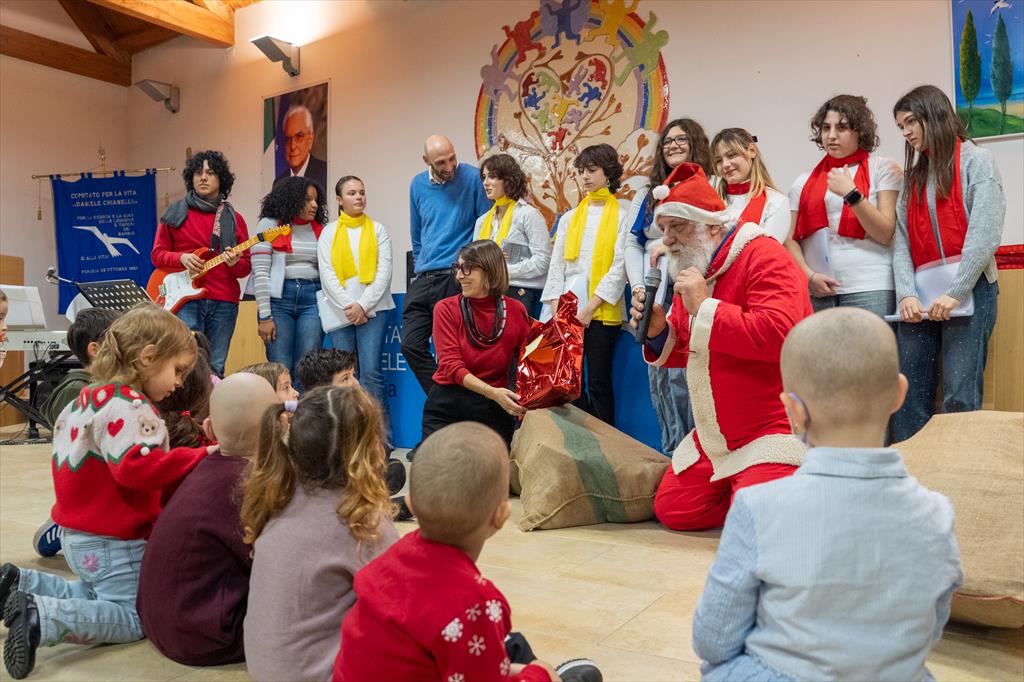 Doni e sorprese per i piccoli ricoverati in Oncoematologia pediatrica e per gli ospiti del Residence "Daniele Chianelli". Anche quest'hanno il Comitato per la vita ha voluto regalare un momento di allegria e spensieratezza. Babbo Natale, con il tradizionale sacco carico di giochi, e la musica di due zampognari, accompagnato dai coniugi Franco e Luciana Chianelli, ha fatto visita al reparto dove è stato ricevuto dal personale medico e infermieristico e accompagnato in ogni stanza dei bimbi per la consegna del dono. Anche quest'anno ogni bambino aveva consegnato ai volontari del Comitato e alle insegnanti della scuola in ospedale dei "Coniglietti bianchi" una letterina con il proprio desiderio che Babbo Natale ha esaudito. Decine di regali che sono stati acquistati da tanti benefattori, in particolare il Centro commerciale Collestrada, con il direttore Roberto Lo Duca, che ha donato moltissimi giochi per tutte le età e la squadra di calcio del Bevagna che ha fatto una raccolta di beneficenza proprio per i regali dei bimbi. Ma non sono mancate le iniziative dei privati, come un giovane ingegnere che ha acquistato alcuni giochi scelti dai bambini. La festa poi è proseguita al Residence "Daniele Chianelli" con tanta musica e canti natalizi coordinati dal musicoterapeuta del Comitato, Lorenzo Capolsini. Il coro dei ragazzi della scuola Giordano Bruno di Perugia si è esibito in canti natalizi accompagnato anche dalla band del Chianelli composta da piccoli pazienti e familiari. La gioia infine è esplosa quando Babbo Natale è entrato al Residence, consegnando ad ogni bimbo e bimba un dono. "Il Natale per noi - ha detto Franco Chianelli - è un momento di grande condivisione, in cui ci sentiamo davvero una famiglia. Una famiglia che sta attraversando una fase difficile, ma che ha accanto tante persone pronte a sostenerla. È anche un momento in cui tanti bimbi guariti, ma ancora affezionati al Residence tornano e consegnano a chi sta affrontando la malattia e le terapie un grande messaggio di speranza e fiducia: guarire è possibile, la malattia è una parentesi che noi cerchiamo di alleggerire il più possibile".