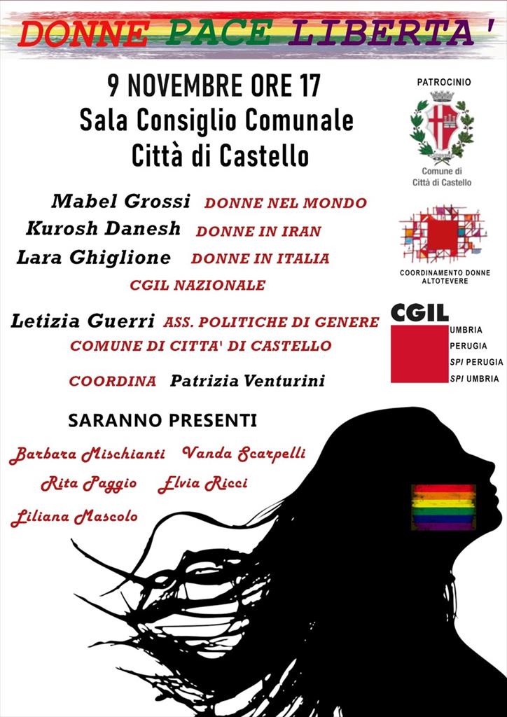 Mercoledì 9 novembre 2022 alle ore 17.00 presso la sala consiliare del Comune di Città di Castello si terrà un seminario per approfondire quello che sta accadendo alle donne e al popolo iraniano e per capire come possiamo stare a fianco di tutte le donne oppresse e private della libertà. L'iniziativa è organizzata dal sindacato pensionati Spi Cgil Alto Tevere, con il suo coordinamento donne, e vi hanno aderito i livelli provinciali di Perugia e regionali di categoria e della Cgil.