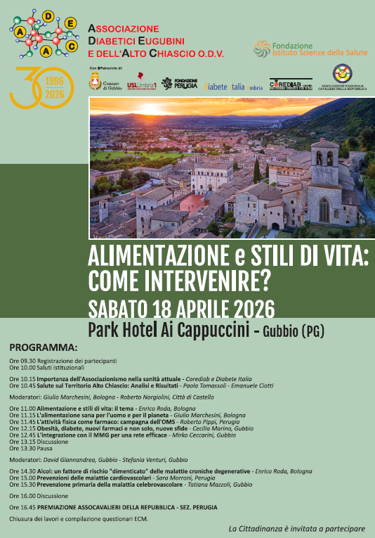 L'Associazione Diabetici Eugubini e dell'Alto Chiascio odv, insieme alla Fondazione Scienze della Salute, ha organizzato l'evento scientifico "Alimentazione e stili di vita: come intervenire?", rivolto a tutti i medici e agli operatori del settore sanitario. L’evento rappresenta un’importante occasione di aggiornamento e confronto su tematiche di grande attualità, in particolare sullo stile di vita e sulle patologie croniche. L’iniziativa è aperta anche a tutta la cittadinanza interessata. È possibile iscriversi al seguente link: