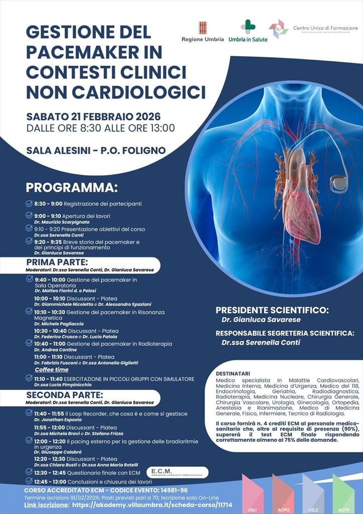 “Gestione del pacemaker in ambiti clinici non cardiologici”. Questo il tema di un interessante convegno scientifico, accreditato ECM dal servizio Formazione e Comunicazione dell'Azienda Usl Umbria 2, in programma sabato 21 febbraio presso la sala Alesini dell’Ospedale "San Giovanni Battista" di Foligno. L'evento formativo, promosso su iniziativa della Cardiologia di Foligno-Spoleto della Usl Umbria 2, risponde ad un’evenienza sempre più frequente nell’attività ospedaliera elettiva ed in urgenza. "Questo perché - spiegano i responsabili scientifici - sempre più pazienti portatori di defibrillatori e/o pacemaker vengono sottoposti ad interventi chirurgici piuttosto che affrontare un trattamento ripetuto di radioterapia o effettuare uno studio di risonanza magnetica. Talora in PS è necessario intervenire con un pacing esterno piuttosto che usare il magnete". Gli esperti si confronteranno inoltre sulle indicazioni e sulle modalità di impianto del loop recorder, un piccolo dispositivo impiantabile sottocute per il monitoraggio continuo del ritmo cardiaco a lungo termine. All’evento prenderanno parte, tra gli altri, il dott. Gianluca Savarese, responsabile dell’attività di elettrofisiologia ed elettrostimolazione, la dott.ssa Serenella Conti, responsabile della Cardiologia del P.O. di Spoleto, il dott. Maurizio Scarpignato Direttore della Struttura Complessa di Cardiologia - Utic di Foligno e Spoleto e il dott. Giuseppe Calabrò- Direttore del Dipartimento di Emergenza della Usl Umbria 2. Il convegno è aperto a tutte le figure sanitarie interessate ed a tutte le branche specialistiche.