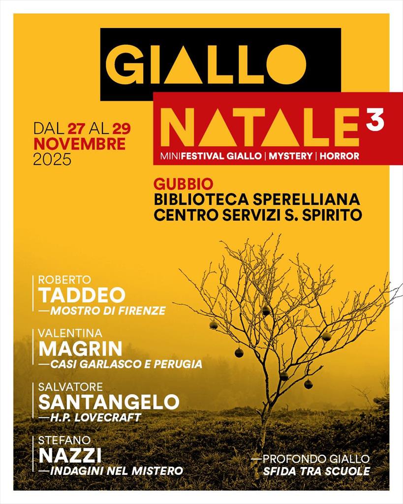 Non c'è due senza tre, anzi, non c'è primo o secondo atto senza una trilogia. Dicembre è alle porte e calano le tenebre su Gubbio dal 27 al 29 novembre con l'avvento di “Giallo Natale. Minifestival del giallo, mystery, horror” per una terza edizione piena di ospiti d'eccezione per serate che intreccieranno labirinti, specchi, immaginari e indagini relative ad alcuni dei più rinomati “Cold case” contemporanei. Si, perchè resta proprio il “True crime” il cuore della manifestazione sempre curata da Giulia Ciarapica e promossa da Comune di Gubbio, Biblioteca Sperelliana e dall'associazione “I Misteri di Gubbio”, con il contributo di numerosi partner(Sezione Soci Coop, Euristica, Cooprogetti, Noleggi Martinelli, Il Garden e Libreria Fotolibri). Un autentico viaggio, sia temporale che geografico, a bordo di una immaginifica “Delorian del brivido”, tra casi di cronaca irrisolti più lontani nel tempo ad altri più recenti fino ad arrivare ad efferati delitti il cui eco da oltreoceano arriva sino al nostro Continente, per serate d'autore sempre accompagnate da richiami letterari e momenti di puro intrattenimento.