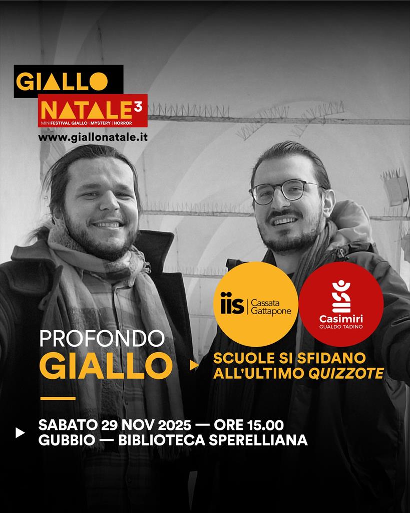 E se il numero 3 è la chiave di volta dell'edizione 2025, il terzo e ultimo giorno presenta tre appuntamenti di spicco per chiudere in grande stile la terza edizione del MiniFestival: Sabato 29 Novembre l'incipit è alle 15 sempre dalla Biblioteca Sperelliana con la sfida letteraria "Profondo Giallo - Sfida all’ultimo Quizzote“, generata dalla collaborazione tra “I Misteri di Gubbio“ e "Don Quizzote", il game show ideato da Capa e Cape (alias Gianluca Capacciola e Sebastiano Ramacci). Due team, composti da studenti dell’IIS Cassata-Gattapone di Gubbio (indirizzi Biologico, Informatico, Sistemi Informativi Aziendali e Turismo) e del Liceo Casimiri di Gualdo Tadino (Liceo Scientifico, Scientifico opzione scienze applicate e Linguistico) si sfideranno attraverso una serie di giochi per dimostrare la loro conoscenza del genere letterario protagonista del Festival, con particolare attenzione a "Il cane di terracotta" di Andrea Camilleri, di cui ricorre il centenario della nascita. La sfida letteraria peraltro sarà ripresa dall'emittente televisiva regionale TRG e sarà successivamente trasmessa sul canale 13 del digitale terrestre