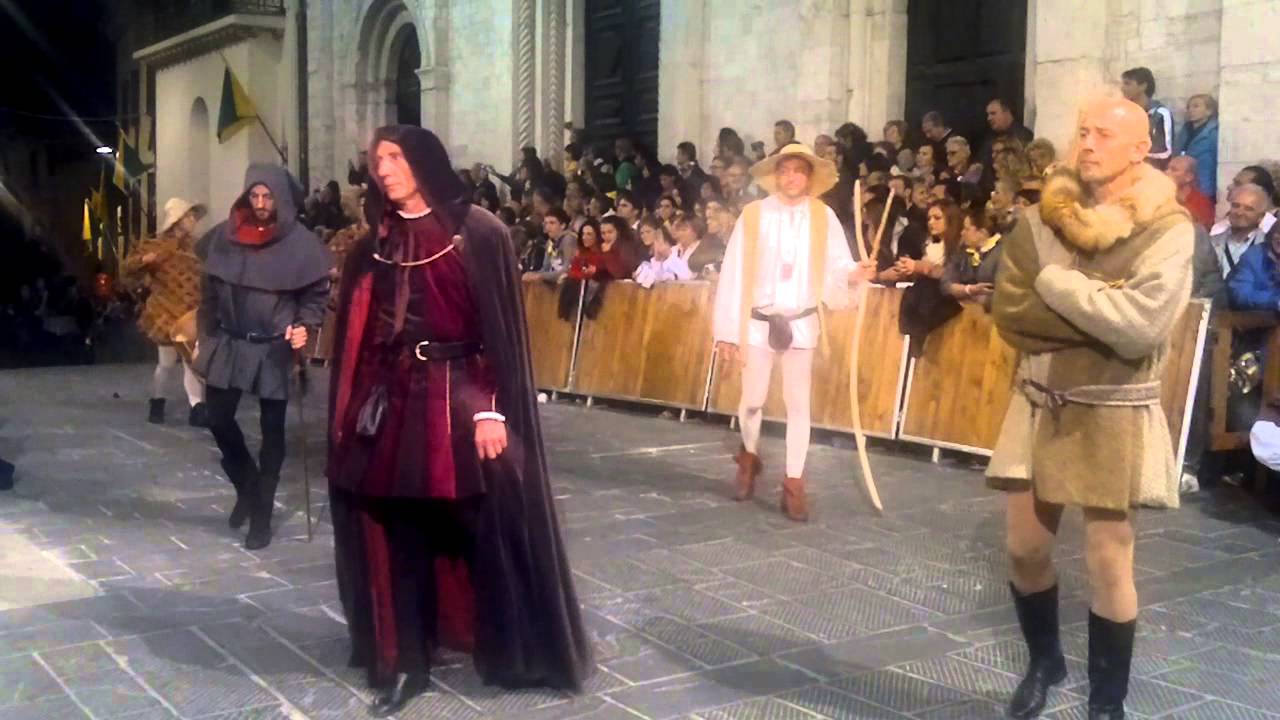 La piazza di Gualdo è uno spazio con una sua precisa e logica morfologia. La città medievale, infatti, e prima ancora quella romana, è identificata da due strade (il cardo e il decumano) che si incrociano e si incontrano nella piazza, dando luogo a quattro parti chiamate appunto quartieri. È da lì che tutto nasce: i rioni, la costruzione delle porte, il senso di appartenenza, la vita associata, la piazza come spazio comune di incontro e confronto. Scegliere di sfilare partendo ognuno dal proprio quartiere e dalla propria strada nella serata del sabato vuol dire usare lo spazio della piazza nella sua “essenza”, per quello che storicamente, simbolicamente e narrativamente è. Tale ragionamento si lega non soltanto al concetto di tradizione – della quale, piaccia o meno, occorre comunque avere rispetto e salvaguardia – ma anche al concetto stesso di rievocazione storica, intesa come riproposizione didattica di valori, istanze e motivazioni del passato.