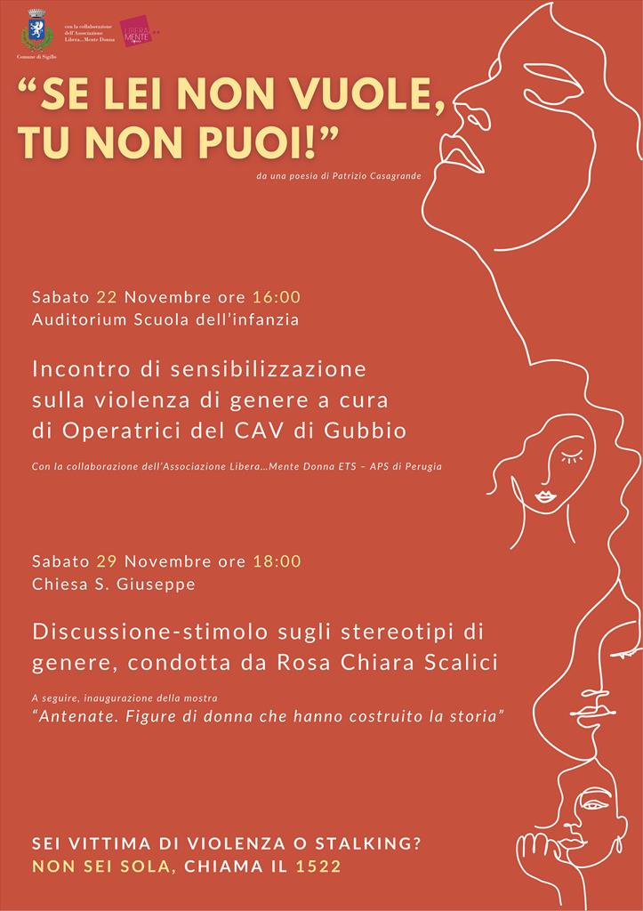 Il 25 novembre, Giornata Internazionale per l’eliminazione della violenza contro le donne, rappresenta un momento prezioso per fermarci, riflettere insieme e rinnovare il nostro impegno contro ogni forma di abuso — fisico, psicologico, economico o culturale — che purtroppo continua a colpire tante donne, vicino a noi e nel mondo. Con questo spirito, l’amministrazione comunale di Sigillo sente forte la responsabilità di promuovere iniziative di incontro e dialogo dedicate a tutta la comunità - scuole, associazioni, famiglie, cittadine e cittadini — con l’obiettivo di condividere una cultura del rispetto, superare stereotipi e discriminazioni e costruire uno sguardo più consapevole e attento sul tema della violenza di genere. E’ proprio il Comune e l’assessora Nadia Tittarelli ad annunciare che nel territorio si svolgeranno due appuntamenti significativi: il 22 novembre, alle ore 16.00, all’Auditorium della Scuola dell’Infanzia e il 29 novembre, ore 18, nella Chiesa di San Giuseppe. Il primo incontro di sensibilizzazione previsto per sabato è rivolto ai giovani della Pro Loco e delle associazioni locali, ed è organizzato in collaborazione con il Centro Antiviolenza di Gubbio e l’Associazione Libera...Mente Donna. Un’occasione per confrontarsi, fare domande, ascoltare testimonianze e acquisire strumenti per riconoscere e contrastare la violenza di genere. Il secondo appuntamento vedrà l’illustratrice e operatrice didattica dell’arte Rosa Chiara Scalici accompagnare il pubblico in un percorso di riflessione attraverso alcune sue opere dedicate a figure femminili che, note o meno note, hanno lasciato un segno nella storia del nostro Paese. Un dialogo per esplorare convenzioni sociali, stereotipi, divari di genere e meccanismi di esclusione. Per l’amministrazione questi momenti rappresentano occasioni di riflessione e confronto, aperte a tutta la comunità, per rafforzare insieme l’impegno contro la violenza sulle donne.