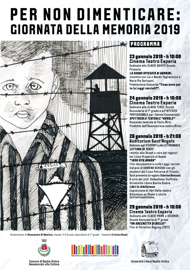 Bastia si prepara a vivere la “Giornata della Memoria del 27 gennaio” con una serie di momenti ed eventi che vedono la cittadinanza e gli studenti del territorio protagonisti. “La ricorrenza della Giornata della Memoria – spiega l’Assessore comunale alle Cultura, alle Pari Opportunità e Politiche Scolastiche, Paola Lungarotti – non riporta alla mente solo il dramma della Shoah, di per sé impossibile da comprendere per la sua incommensurabile disumanità, ma segna anche la ricorrenza degli ottanta anni dalla promulgazione delle Leggi razziali che possono ritenersi, a ragione, l’anticamera dell’olocausto stesso”. Il Tavolo per le Pari Opportunità del Comune a tal proposito propone una serie di iniziative dedicate alla settimana della Memoria, oltre al Concorso bandito per le classi quinte della scuola primaria dal titolo “Cosa sono per te le leggi razziali?”, la cui premiazione avverrà Mercoledì 23 gennaio al termine dell’incontro dal titolo “La Shoah spiegata ai bambini” delle ore 10.00 al Cinema teatro Esperia. Ad incontrare gli studenti saranno Lia e Nando Tagliacozzo e Maria Pia Serlupini. Nando Tagliacozzo è testimone di questa tragedia: era solo un bambino quando vide deportare sua sorella e sua nonna ad Auschwitz. In seguito perse suo padre venduto ai nazisti da una spia. Lia Tagliacozzo, esperta di cultura ebraica, è autrice di libri per ragazzi sul tema della Shoah; Maria Pia Serlupini è la garante regionale per l’infanzia e l’adolescenza. Giovedì 24 gennaio alle ore 10.00 presso il Cinema Teatro Esperia le classi 3^ della scuola secondaria di 1° grado e Istituto professionale per il commercio assisteranno allo spettacolo teatrale “NUVOLE”, prodotto dall’Associazione umbra Ritmi. La rappresentazione teatrale ripercorre idealmente l’itinerario di solidarietà seguito nel 1943 e nel 1944 da Gino Bartali, raccontando ai più giovani questo pezzo tanto bello quanto poco conosciuto della recente storia del nostro Paese. L’Opera teatrale è interpretata dall’attore Stefano Venarucci con il commento musicale di Giuseppe Barbaro. L’allestimento dello spettacolo è impreziosito da un elemento scenografico speciale realizzato dall’artista assisano Claudio Carli: una lunga tela raffigurante un sentiero che si perde nel bosco. Sabato 26 gennaio alle ore 21.00 all’Auditorium Sant’Angelo verranno letti testi relativi alla Shoah a cura dei ragazzi del Liceo Properzio di Assisi. Dopodiché verrà proiettato il Film-documentario “1938 Vita Amara” di Sabrina Benussi. Si tratta di un documentario sulle Leggi razziali italiane realizzato insieme agli studenti del Liceo Petrarca di Trieste con visione anche del video illustrativo della relativa mostra. All’incontro, curato dal professor Sebastiano Giuffrida dell’Università Libera di Bastia Umbra, sarà presente la regista Sabrina Benussi. Martedì 29 gennaio alle ore 10.00 al Cinema Teatro Esperia le classi 1^ e 2^ della scuola secondaria di 1° grado assisteranno alla proiezione della pellicola “Un sacchetto di biglie” di Christian Duguay (2017) che narra della storia realmente accaduta di Joseph e Maurice Joffo, due fratelli ebrei che, bambini, vivono nella Francia occupata dai nazisti. Per tutta la settimana la Biblioteca comunale “A. La Volpe” esporrà libri sulla Shoah e storia dell’antisemitismo. La locandina di presentazione degli eventi raffigura un’illustrazione realizzata dallo studente Alessandro Di Mestico della classe III G Scuola Secondaria di I° Grado, docente Cristina Rossi.