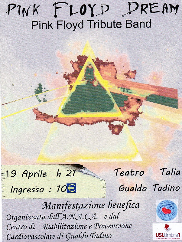 A Gualdo Tadino domani sera al teatro Talia va in scena la serata musicale di beneficenza dal titolo Pink Floyd Dream con la Pink Floyd tribute band sul palco a rispolverare i successi della mitica band anglosassone. La serata, a partire dalle ore 21, avrà ingresso unico di 10 euro in beneficenza ed è organizzata dall'ANACA associazione cardiopatici di Gualdo Tadino, dal centro di riabilitazione cardiovascolare di Gualdo Tadino con il patrocinio del Comune e della Usl.