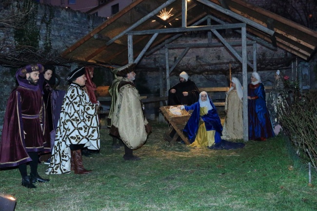 Arriveranno anche i Re Magi ad arricchire il Presepio vivente “Venite Adoremus” organizzato dall’Associazione culturale Capezza presso l’Istituto “Bambin Gesù”. Un’autentica ciliegina sulla torta di un evento che tanto successo di pubblico e di critica ha registrato nelle sue prime due giornate con oltre duemilaquattrocento presenze. Il Presepio tornerà dunque il 5 gennaio alle ore 21, sempre presso gli orti dell’Istituto delle suore gualdesi, riproponendo i quadri che hanno animato le prime due giornate. Per il giorno dell’Epifania, invece, fedeli alla tradizione che vuole l’arrivo dei Magi in tale giornata e a quanto raffigurato da Gentile da Fabriano – cui il Presepio di Capezza quest’anno s’ispira – i quadri del Presepio si arricchiranno di queste tre figure: i Re Magi arriveranno in un sontuoso corteo a cavallo, accompagnati dal loro numeroso seguito, come nel dipinto di Gentile. Non sarà la sola novità. Infatti, nella giornata dell’Epifania, il sottofondo musicale che accompagna i visitatori sarà proposto dal vivo dalla Corale Cai “Raffaele Casimiri”, diretta dal maestro Felice Pericoli. Anche questa una novità assoluta per il Presepio “Venite Adoremus”. «Volevamo chiudere questa stupenda esperienza con qualcosa di veramente importante, che confermasse e rinnovasse il successo del nostro Presepio. Da qui la scelta del corteo dei Magi e dell’esibizione della Corale Cai, che impreziosiranno il già ricco quadro creato dai nostri associati e figuranti presso l’Istituto “Bambin Gesù”», spiega il presidente Michele Storelli. I Re Magi partiranno da piazza Garibaldi intorno alle 17 – compatibilmente con la festa della Befana in piazza Martiri della Libertà – per raggiungere in corteo la Natività realizzata in via Cesare Battisti. Qui troveranno il suggestivo spazio illuminato dalle luci di fiaccole e fuochi, in uno scenario capace di proiettare i visitatori in un affascinante spaccato del XV secolo, con personaggi vestiti con abiti regali o popolari secondo l’uso quattrocentesco. Per l’occasione sono stati inoltre predisposte delle botteghe che richiamano i mestieri artigiani della tradizione gualdese, ceramista-fabbro-falegname, la lavorazione del formaggio, la locanda, la stupenda novità degli alchimisti e le altre novità che saranno riproposte il 5 e 6 gennaio. Il presepe rimarrà aperto sino alle 19.30.