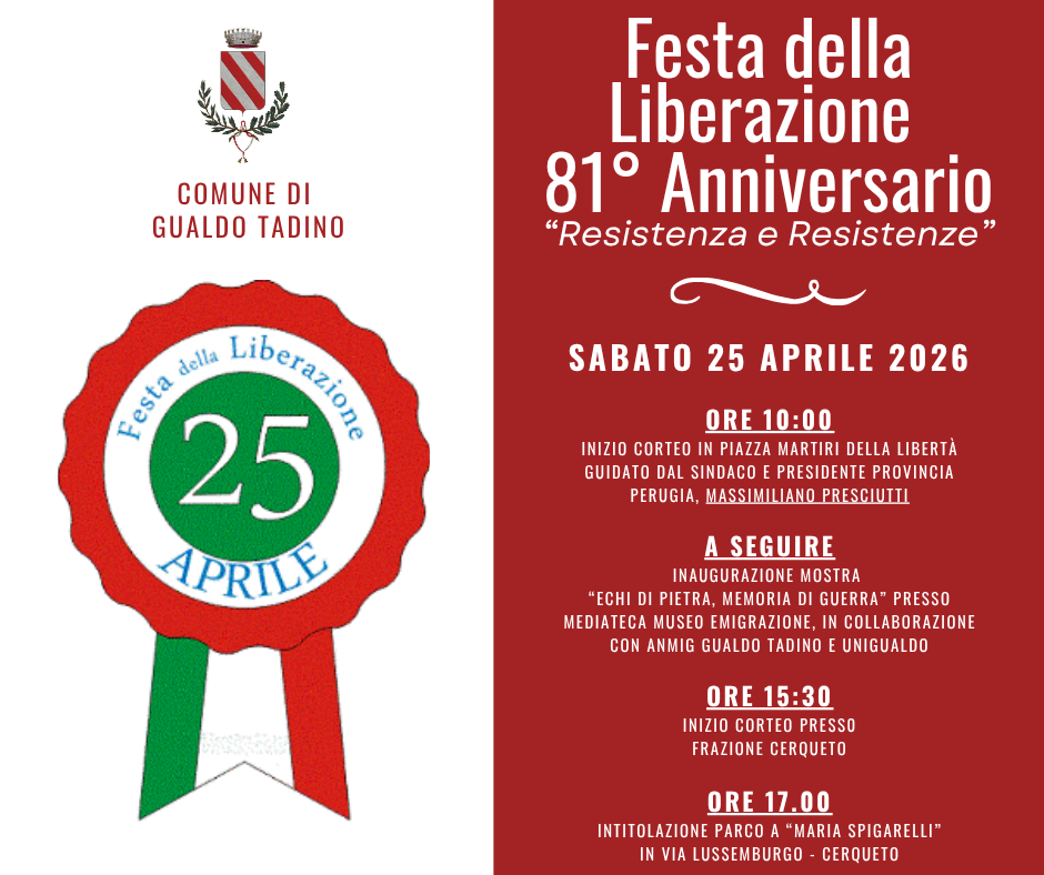 L’Amministrazione Comunale di Gualdo Tadino invita tutti i Cittadini e le Associazioni a partecipare Sabato 25 aprile 2026 in Piazza Martiri al corteo commemorativo (ore 10) organizzato per celebrare l’81° anniversario della Liberazione che sarà guidato dal Sindaco e Presidente della Provincia di Perugia, Massimiliano Presciutti. A seguire, grazie alla collaborazione tra il Comune di Gualdo Tadino con ANMIG Gualdo Tadino e Unigualdo, si svolgerà presso la Mediateca del Museo dell’Emigrazione l’inaugurazione della mostra “Echi di pietra, memoria di guerra” (pittura, ceramica e fotografia in dialogo). Alcuni artisti gualdesi esporranno i loro manufatti. Nel pomeriggio, invece, dopo il Corteo che si svolgerà al Cerqueto alle ore 15.30, sempre nella stessa frazione, in via Lussemburgo, alle ore 17 avverrà l’intitolazione del parco adiacente alla gualdese e partigiana “Maria Spigarelli” (nell’ambito del progetto, già iniziato, di intitolazione da parte dell’Amministrazione Comunale di alcune aree verdi cittadine a figure femminili di grande rilievo storico nazionale e locale: giugno 2025 con i Giardini della Rocca Flea intitolati ad Anna Kulisciof, medico, rivoluzionaria e figura centrale del movimento femminista italiano e a novembre sempre del 2025 con l’intitolazione del Parco Campetti S. Rocco a Tina Anselmi, sindacalista e politica impegnata nella tutela dei diritti delle donne e dei lavoratori). Il 25 aprile è un giorno fondamentale per la storia d’Italia ed assume un particolare significato ricordare gli eroi antifascisti della resistenza che hanno dato la vita per difendere la democrazia e la libertà.