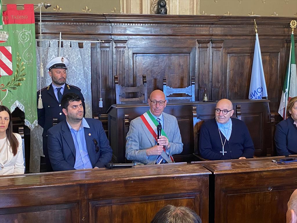 La comunità di Gualdo Tadino, nella giornata di domenica 26 aprile, ha dato il benvenuto al nuovo Vescovo, monsignor Felice Accrocca. Dopo l’incontro con il Consiglio pastorale cittadino, le associazioni, i gruppi, i movimenti e le confraternite del territorio presso la Chiesa di Santa Maria dei Raccomandati, il Vescovo è stato accolto presso la Sala Consiliare del Municipio, dove il Sindaco e Presidente della Provincia di Perugia, Massimiliano Presciutti, insieme alla Giunta Comunale, ha ricevuto ufficialmente il nuovo Pastore della Diocesi di Assisi-Nocera Umbra-Gualdo Tadino e Foligno. L’incontro si è svolto in un clima di grande partecipazione e cordialità, alla presenza di numerose autorità civili e militari del territorio, oltre a rappresentanti delle associazioni locali, dei movimenti e delle diverse realtà sociali cittadine, a testimonianza del forte senso di comunità e dell’importanza dell’evento per l’intero territorio. Nel corso del ricevimento, il Sindaco Presciutti ha rivolto al Vescovo un caloroso saluto di benvenuto, sottolineando come «la forza della città di Gualdo Tadino risiede in uno spirito comunitario autentico, che ci permette di operare da anni andando oltre le singole appartenenze politiche per il bene esclusivo del territorio. Tra noi amministratori locali esiste un rapporto di amicizia che precede il ruolo istituzionale e che ci consente di affrontare insieme le sfide delle aree interne, superando ogni divisione per far crescere le nostre comunità. Un ringraziamento speciale va a tutte le associazioni e ai volontari, che rappresentano un tassello fondamentale della nostra società e che, con il loro impegno quotidiano, alimentano la comunità. Insieme continueremo a trovare la strada giusta per affrontare le difficoltà, puntando sempre sulla collaborazione e sul rispetto reciproco». In segno di accoglienza e vicinanza, l’Amministrazione Comunale ha donato al Vescovo un quadro in ceramica raffigurante San Michele Arcangelo. Da parte sua, il Vescovo ha evidenziato il valore della comunità locale, affermando che «in questo territorio percepisco una straordinaria effervescenza sociale, dove il ruolo delle associazioni è fondamentale perché chi compie un servizio fa un dono agli altri, ma dà anche significato e sapore alla propria vita. In un tempo in cui la vita tende a individualizzarsi e la tecnica rischia di chiuderci nelle case portando solitudine e tristezza, dobbiamo riscoprire il valore profondo dell'incontro e della relazione. La Chiesa e l'amministrazione hanno il compito comune di alzare lo sguardo oltre l'interesse personale per far prevalere il bene comune. La bellezza che ci circonda è una potenzialità e una ricchezza che dobbiamo preservare, consapevoli che solo cambiando insieme e lavorando per ciò che appartiene a tutti potremo costruire un futuro solido e fraterno». Al termine dell’appuntamento in Sala Consiliare, il Vescovo si è recato presso la Cattedrale di San Benedetto, dove ha proceduto alla benedizione della campana celebrativa del VII Centenario della morte del Beato Angelo, patrono gualdese. Successivamente ha celebrato la Santa Messa e somministrato il sacramento della Cresima ai giovani gualdesi, in un momento di grande partecipazione e raccoglimento per tutta la comunità.