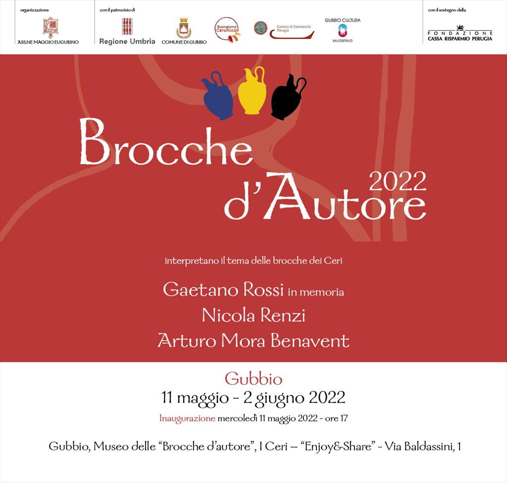 Dopo l’interruzione forzata – causa Covid – nel biennio 2020-2021, la mostra Brocche d’autore, organizzata dall’Associazione Maggio Eugubino, giunge quest’anno alla diciannovesima edizione. Con le finalità di sempre: allestire una significativa esposizione tesa a sottolineare il rapporto tra i Ceri e la ceramica d’arte contemporanea. L’intento della mostra è infatti quello di «arricchire le tradizionali manifestazioni di maggio per mezzo di un’iniziativa culturale pertinente al clima festivo, tale da destare l’interesse sia dei visitatori sia degli eugubini, ma anche opportunamente legata al settore della ceramica di artigianato artistico, assai rilevante nella nostra città, con delle proposte di alta qualità relative a uno dei prodotti tipici - anzi emblematici - dell’odierna maiolica eugubina, vale a dire le brocche dei Ceri. L’iniziativa consiste nella creazione di inedite brocche dei Ceri da parte di artisti della ceramica informati sulla tipologia di questi manufatti, nonché sulla funzione e sul valore simbolico dei ‘contenitori rituali’, secondo le interpretazioni fornite dai principali studiosi della Festa dei Ceri dall’Ottocento ai nostri giorni. Essa rappresenta, quindi, anche un terreno di ricerca intorno a uno specifico e caratteristico oggetto, sul quale potranno via via intervenire numerosi artisti della ceramica, interpretandone forme e decorazioni, tanto da rendere possibile nel tempo la costituzione di una collezione a testimonianza di un gusto e di una creatività che proprio iniziative del genere intendono stimolare e favorire». La creazione delle brocche d’autore 2022 è stata affidata al perugino Nicola Renzi e allo spagnolo Arturo Mora Benavent. Per quanto riguarda Gubbio, presentiamo il lavoro progettato nel 2019 dal compianto Gaetano Rossi, al quale era stato affidato l’incarico di realizzare le brocche per l’edizione, in seguito annullata, del 2020.