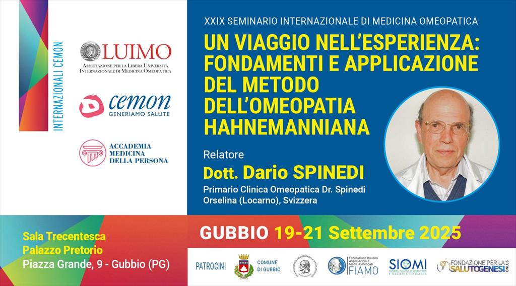Gubbio ospita il 29° Seminario Internazionale di Medicina Omeopatica, dal titolo: “Un viaggio nell’esperienza. Fondamenti e applicazione del metodo dell’Omeopatia Hahnemanniana”. L'evento, nella Sala Trecentesca di Palazzo Pretorio, in Piazza Grande, in programma fino a domenica 21 settembre, offre un'occasione formativa di grande prestigio per medici, professionisti sanitari e studiosi del settore. Organizzato da CeMON Generiamo Salute e LUIMO (Associazione per la Libera Università Internazionale di Medicina Omeopatica), con il patrocinio del Comune di Gubbio e delle più importanti associazioni del settore, come la Liga Medicorum Homoeopathica Internationalis (LMHI), La Federazione Italiana delle Associazioni e dei Medici Omeopatici (FIAMO) e la Società Italiana di Omeopatia e di Medicina Integrata (SIOMI), vedrà la partecipazione del Dr. Dario Spinedi, uno dei massimi esperti mondiali di omeopatia classica, primario del reparto di Omeopatia della Clinica Dr. Spinedi di Orselina (Locarno) in Svizzera, dove un'equipe di medici omeopati cura gravi malattie croniche, prevalentemente casi oncologici. Il seminario approfondirà i fondamenti epistemologici dell’omeopatia hahnemanniana, con particolare attenzione all’analisi dei casi clinici complessi, alla comprensione delle malattie croniche e alle sfumature metodologiche, fornendo strumenti pratici per la corretta scelta del rimedio, della potenza e della posologia. La metodologia proposta dal Dr. Spinedi, allievo di J. Künzli von Fimmelsberg, unisce rigore scientifico e fedeltà alla tradizione hahnemanniana, ponendo al centro l’individualità del paziente. Un'occasione unica per aggiornarsi, confrontarsi e crescere professionalmente nel cuore dell’omeopatia internazionale, in una location stimolante e carica di valori culturali.