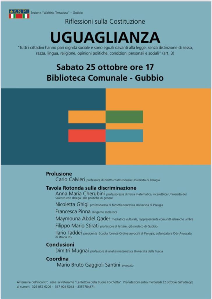 Si parlerà di uguaglianza e discriminazione analizzando i diversi aspetti: sesso, razza, lingua, religione, opinioni politiche, condizioni personali e sociali nella tavola rotonda che la sezione Anpi “Walkiria Terradura” di Gubbio ha organizzato per sabato 25 ottobre alle ore 17 alla Biblioteca Sperelliana. Al dibattito, coordinato dall’avvocato Mario Bruto Gaggioli Santini, parteciperanno i docenti universitari Carlo Calvieri, Annamaria Cherubini, Nicoletta Ghigi, Dimitri Mugnai. Interverranno anche la dirigente scolastica Francesca Pinna, la mediatrice culturale Maymouna Abdel Qader e il già sindaco di Gubbio Filippo Mario Stirati. Quello del 25 ottobre sarà il primo di una serie di incontri di approfondimento che l’Anpi farà nei prossimi mesi su altri articoli della Costituzione.