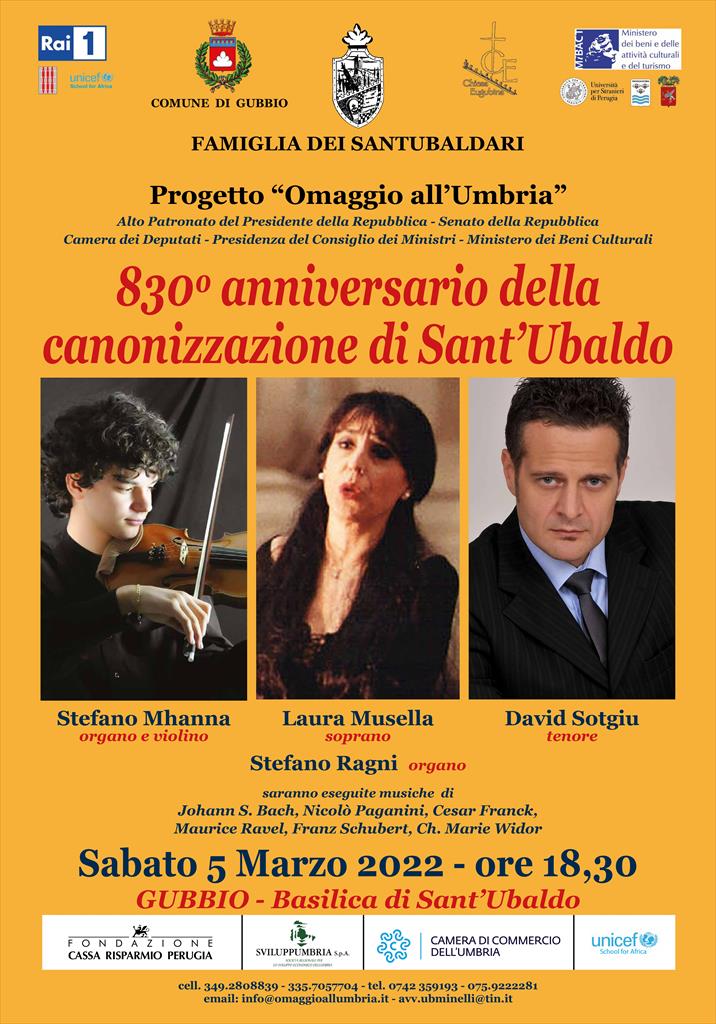 Dopo due anni di sofferta sospensione per la situazione di emergenza sanitaria da covid 19, la Famiglia dei Santubaldari, in sinergia con l’artista Laura Musella, soprano di fama internazionale, fondatrice e direttore artistico del Festival Omaggio all’Umbria, di cui è direttore testimonial Zubin Mehta, uno dei più grandi direttori d’orchestra del mondo, con l’Alto Patronato del Presidente della Repubblica, Senato della Repubblica, Camera dei Deputati, Presidenza del Consiglio dei Ministri, con il patrocinio del Ministero per i Beni e le Attività Culturali, della Regione Umbria, della Provincia di Perugia, della Diocesi di Gubbio, del Comune di Gubbio, della Fondazione C.R. di Perugia, di Sviluppumbria, ripropone, nell’ambito delle solenni celebrazioni dell’830° anniversario della canonizzazione di Sant’Ubaldo, il tradizionale evento di particolare spessore culturale musicale, il Concerto della Canonizzazione, quest’anno giunto alla XIIIª edizione, nel giorno di sabato 5 marzo p.v., alle ore 18,30, presso la Basilica Santuario di Sant’Ubaldo. Saranno nell’occasione eseguite musiche di Johann S. Bach, Franz Schubert, Nicolo’ Paganini, Maurice Ravel, Alessandro Stradella, Cesar Franck, Ch. Marie Vidor.