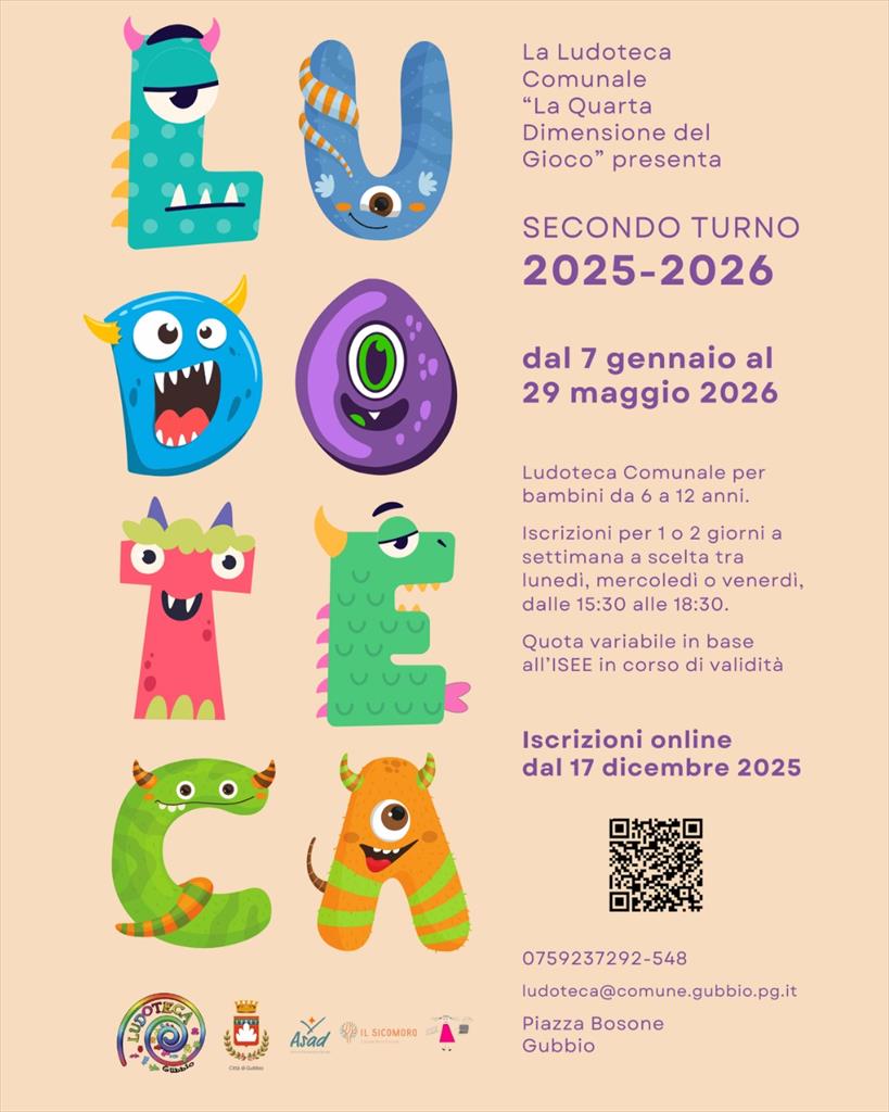 Dal 7 gennaio 2026 la Ludoteca comunale in Piazza Bosone, apre le sue porte per bambine e bambini a partire dai 6 anni di età, per il secondo turno di attività che si concluderà il 29 maggio.