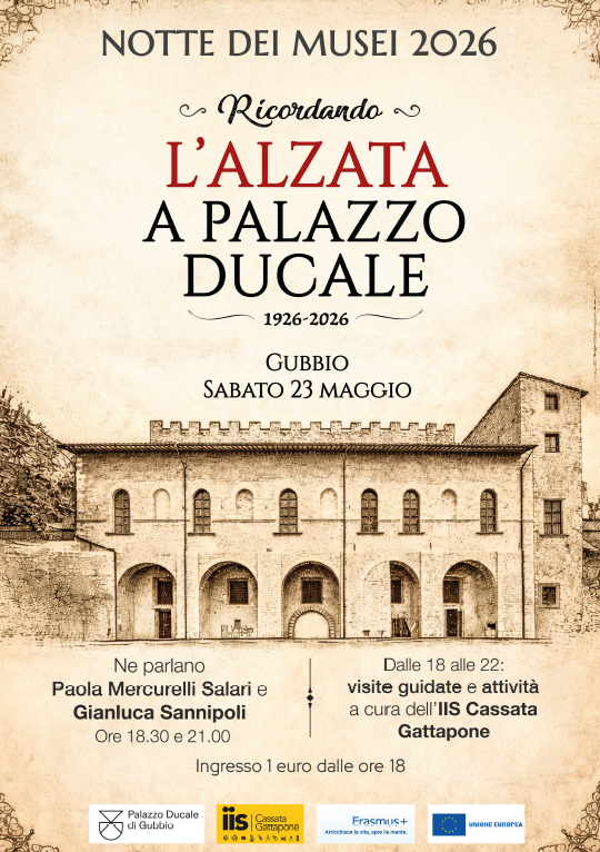 In occasione della “Notte Nazionale dei Musei” di sabato 23 maggio 2026, al Museo di Palazzo Ducale di Gubbio si festeggerà il primo centenario dall’Alzata dei Ceri nel cortile di Palazzo Ducale: un avvenimento unico e fondamentale per l'identità civica del nostro territorio. Durante la serata dal titolo “Ricordando l'Alzata a Palazzo Ducale (1926-2026)”, si farà memoria di questo pezzo di storia eugubina con un duplice appuntamento, pomeridiano alle ore 18:30 e serale alle ore 21:00. In questi orari, la dott.ssa Paola Mercurelli Salari, Direttrice del Museo di Palazzo Ducale di Gubbio, e Gianluca Sannipoli, studioso di storia locale che interverrà per conto del Centro di Documentazione Festa dei Ceri “Adolfo Barbi”, terranno una conferenza sulla storia dei Ceri e sull'Alzata a Palazzo Ducale del 1926. L'evento è frutto della pluriennale collaborazione tra i Musei Nazionali di Perugia -Direzione regionale Musei nazionali dell’Umbria, nella persona della Dott.ssa Mercurelli Salari, e l’Istituto d’Istruzione Superiore “Cassata-Gattapone” di Gubbio, grazie al coinvolgimento dei docenti e degli alunni degli indirizzi “Turismo”, “Industria e Artigianato per il Made in Italy” e “Agrario - Gestione Ambiente e Territorio". Come di consueto, dalle ore 18:00 alle 22:00, gli studenti dell'indirizzo Turismo guideranno i visitatori alla scoperta della storia e delle bellezze architettoniche e artistiche del Palazzo. Durante il percorso, sarà possibile ammirare gli abiti teatrali confezionati dalle studentesse dell’indirizzo Industria e Artigianato per il Made in Italy per lo spettacolo “Ubaldo, l’eterno miracolo”, dedicato al Santo Patrono e andato recentemente in scena presso il Teatro Comunale di Gubbio, mentre gli allievi dell’indirizzo Agrario offriranno degustazioni di prodotti tipici umbri che valorizzano la filiera locale, dando prova della fruttuosità della collaborazione tra le diverse Istituzioni, Enti e realtà territoriali. La partecipazione all'evento avrà il costo simbolico di 1 euro e si svolgerà anche in caso di maltempo; per l'occasione, per facilitare il raggiungimento di Palazzo Ducale, gli ascensori rimarranno aperti fino alle ore 22:30.