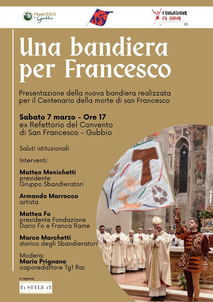 Sabato 7 marzo alle ore 17, nell’ex Refettorio del Convento di San Francesco a Gubbio, si terrà una Tavola Rotonda dal titolo “Una bandiera per Francesco”. L’iniziativa si inserisce nel calendario di appuntamenti dedicati alla ricorrenza francescana e rappresenta un momento di incontro tra arte, tradizione e memoria storica. L’evento è promosso dall’associazione Francesco a Gubbio, dal Gruppo Sbandieratori di Gubbio e dalla Fondazione Dario Fo e Franca Rame ETS, realtà che collaborano per valorizzare il legame tra la figura del Santo e la città umbra. Il programma prevede i saluti istituzionali e una serie di interventi che accompagneranno il pubblico alla scoperta del significato e della genesi della nuova bandiera. Interverranno Matteo Menichetti, presidente del Gruppo Sbandieratori; l’artista Armando Marrocco, autore del progetto; Mattea Fo, presidente della Fondazione Dario Fo e Franca Rame; Marco Marchetti, storico degli Sbandieratori, che offrirà un approfondimento sul valore simbolico e identitario delle insegne nella tradizione eugubina. A moderare l’incontro sarà il giornalista Mario Prignano, caporedattore del Tg Rai, che guiderà il dialogo tra arte contemporanea e rievocazione storica, in un contesto fortemente evocativo come quello del complesso conventuale di San Francesco. La presentazione della bandiera, ideata dal Maestro Marrocco e realizzata da Ti Style, non sarà soltanto un momento celebrativo, ma anche un’occasione di riflessione sul patrimonio culturale immateriale rappresentato dagli Sbandieratori e sul messaggio universale di pace e fraternità lasciato da San Francesco. Per suggellare questo messaggio, sarà esposta la cartella d’autore realizzata da Dario Fo per il Premio Bandiera 2013 e la serigrafia della stessa grazie al contributo della Fondazione Dario Fo e Franca Rame ETS. Un appuntamento che unisce istituzioni, associazioni e mondo culturale nel segno di una tradizione che continua a rinnovarsi.